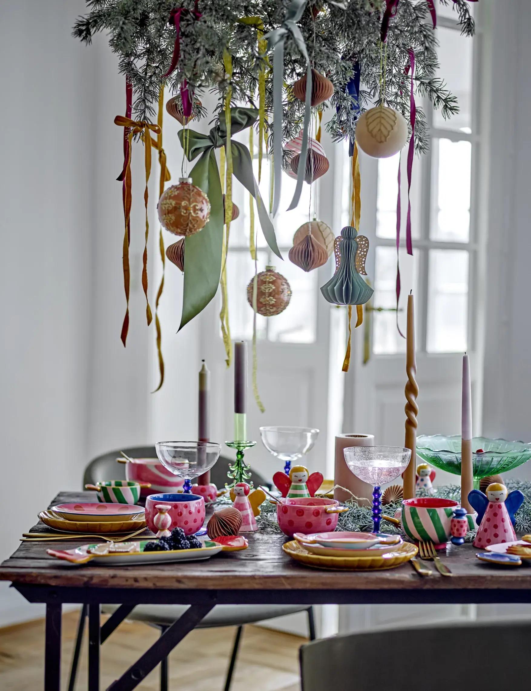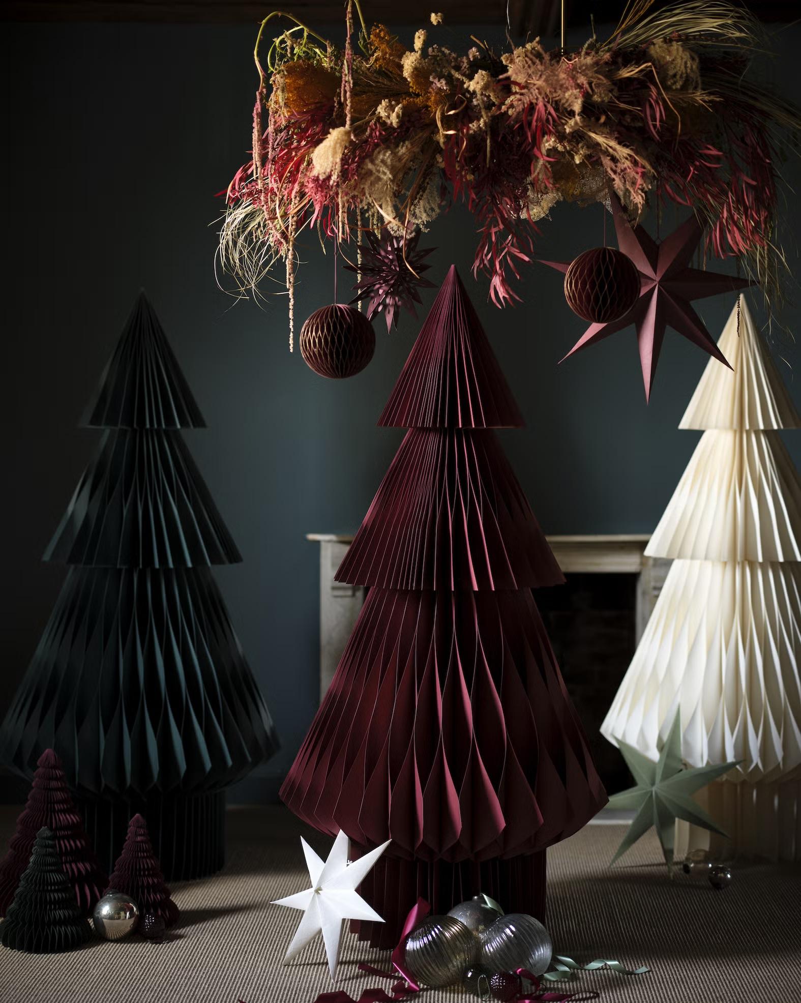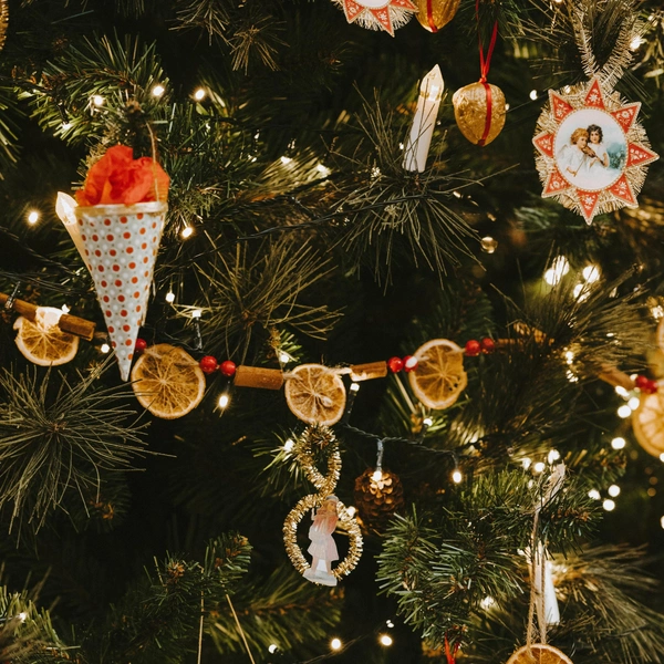 Повесьте новогодний венок из свежей или сухой зелени, большие самодельные бумажные украшения или традиционный мобиль, создающий праздничную атмосферу.