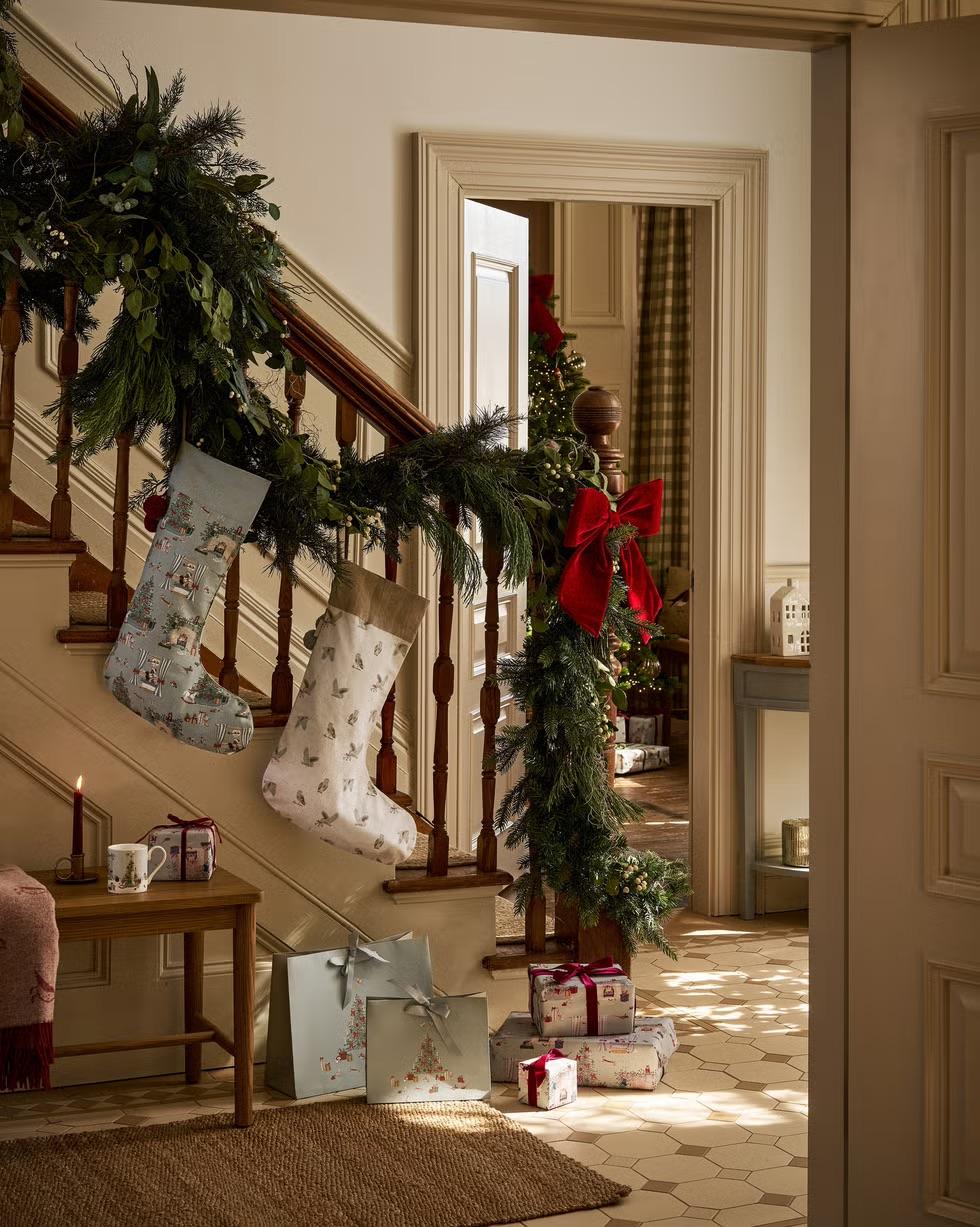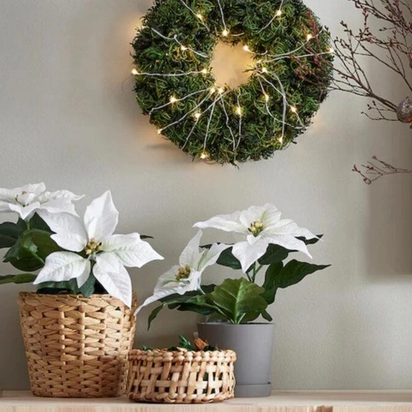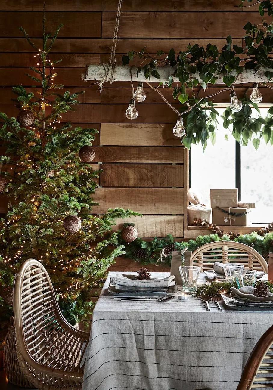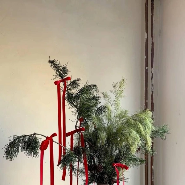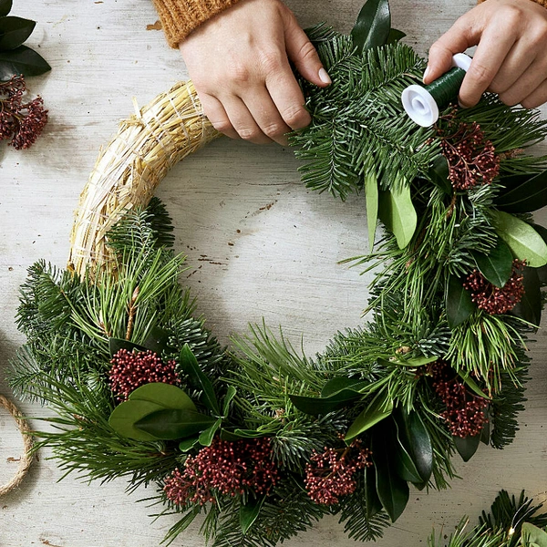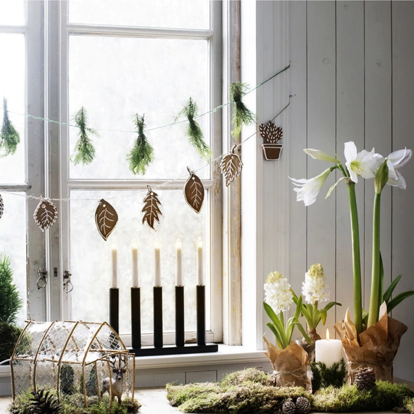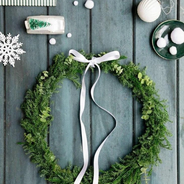 Связки еловых веток, омела, белые нарциссы — не стесняйтесь дополнить эти растения елочными игрушками, птичками на прищепках, гофрированными бумажными украшениями.