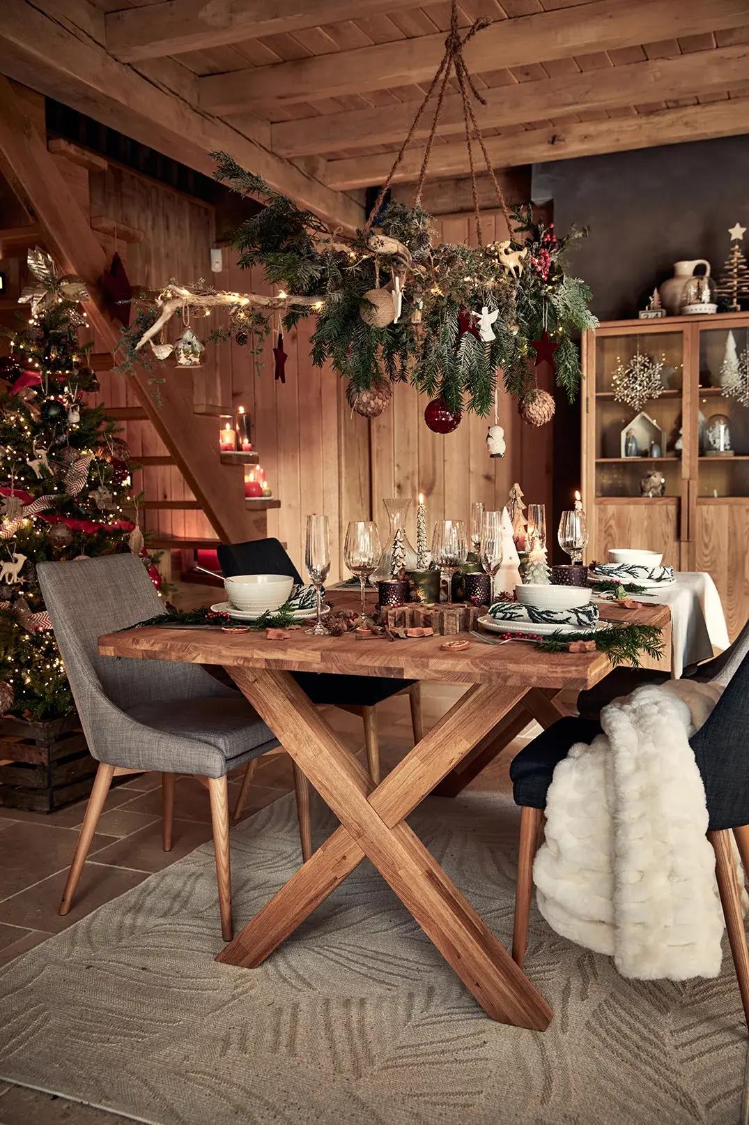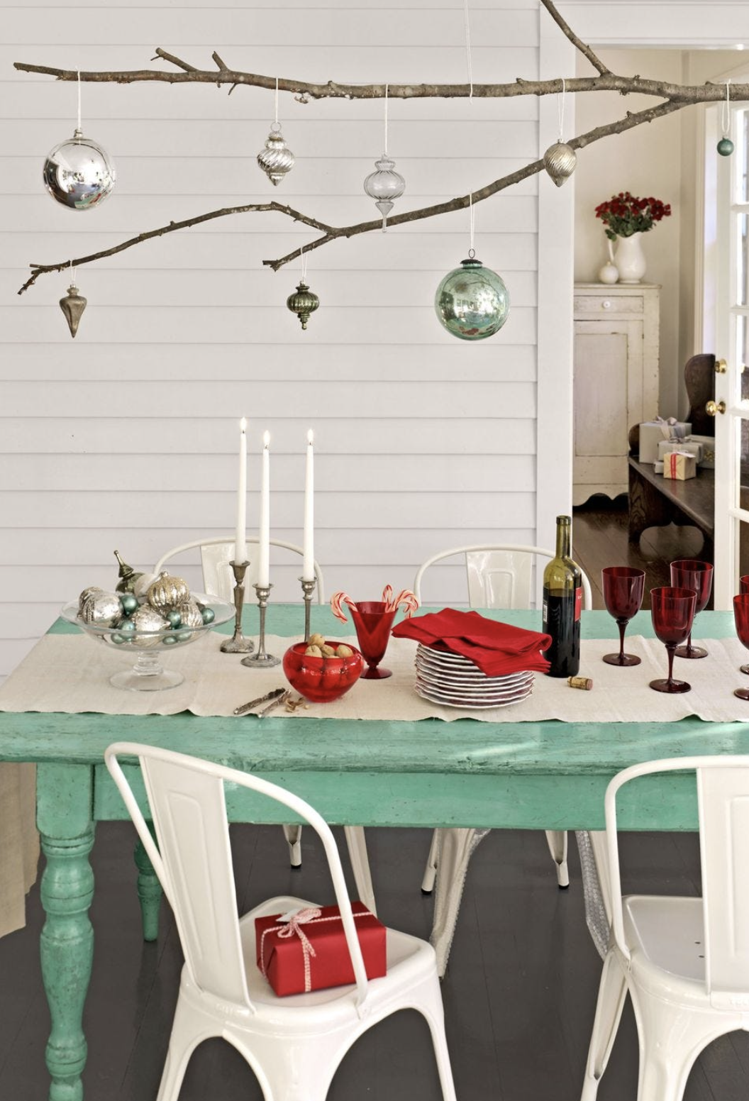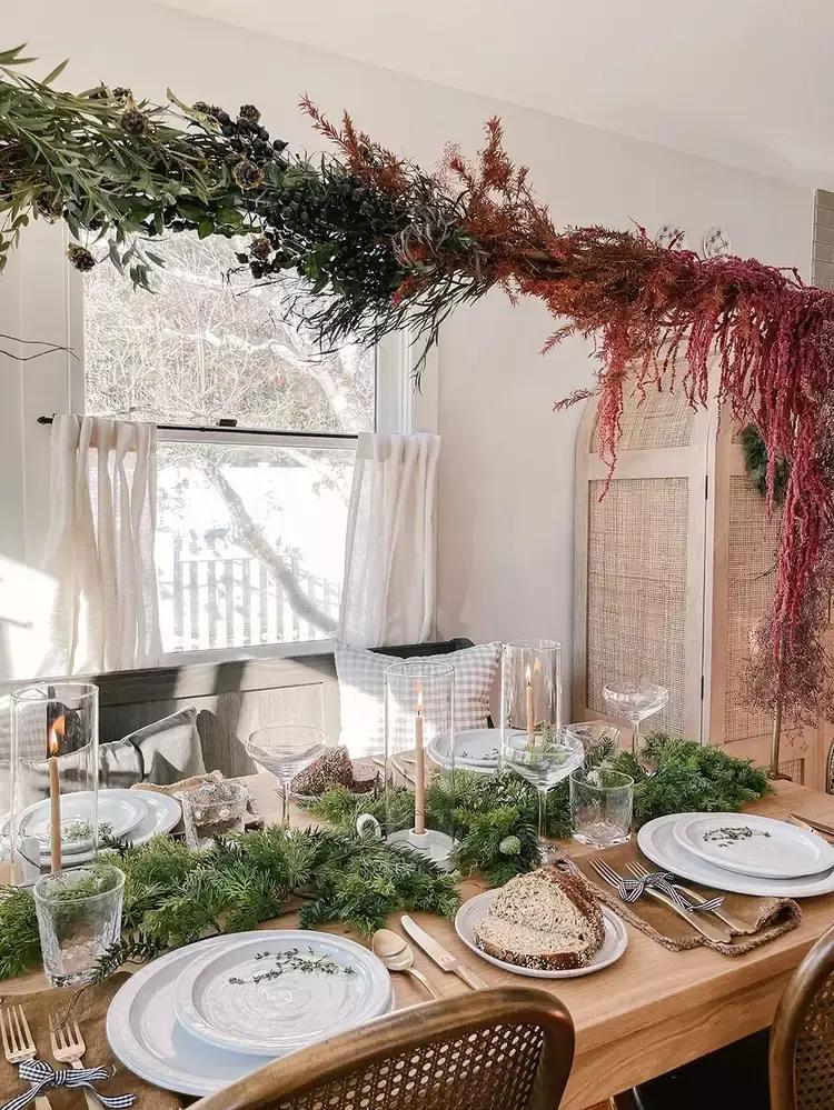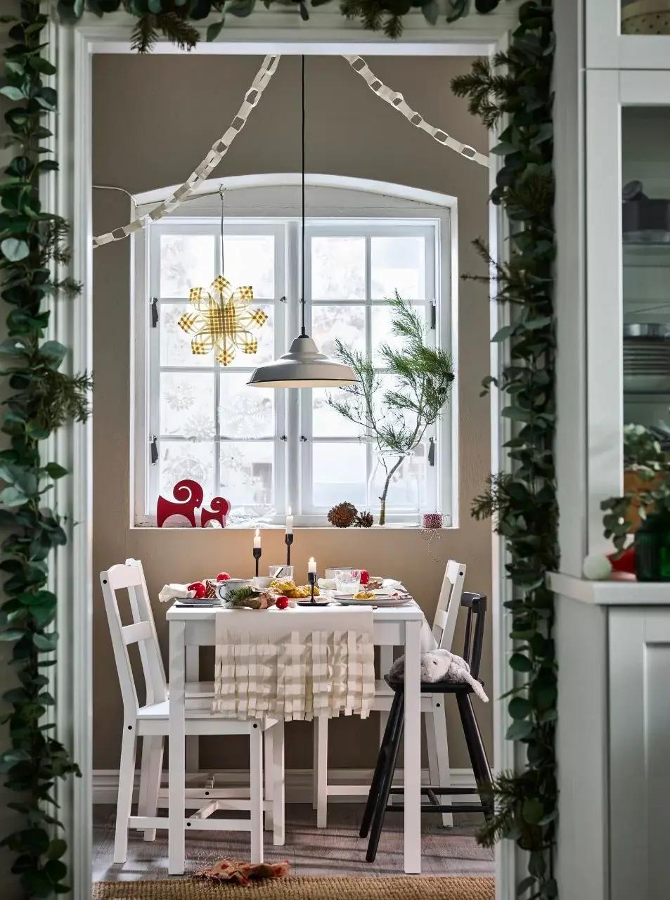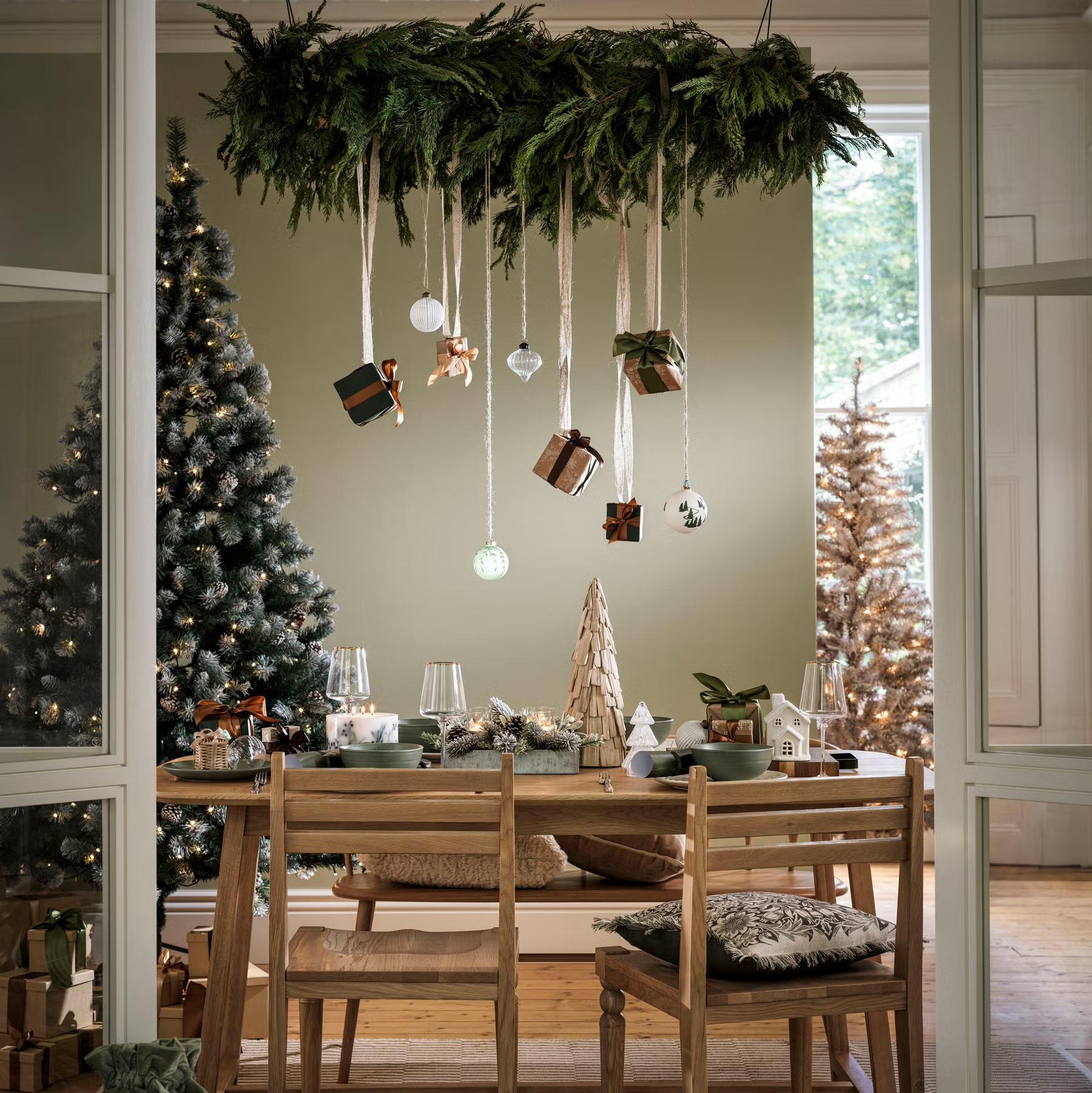 Несколько отрезков мишуры или бумажных снежинок, развешенных на расстоянии друг от друга, не создадут того самого «вау»-эффекта. Нужно сосредоточить украшения в одном месте. Идеально подойдет зона над обеденным столом, если это не будет мешать освещению.
