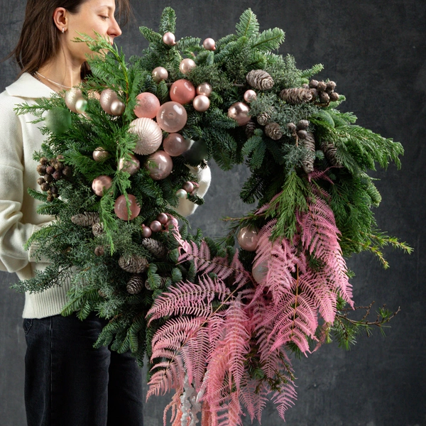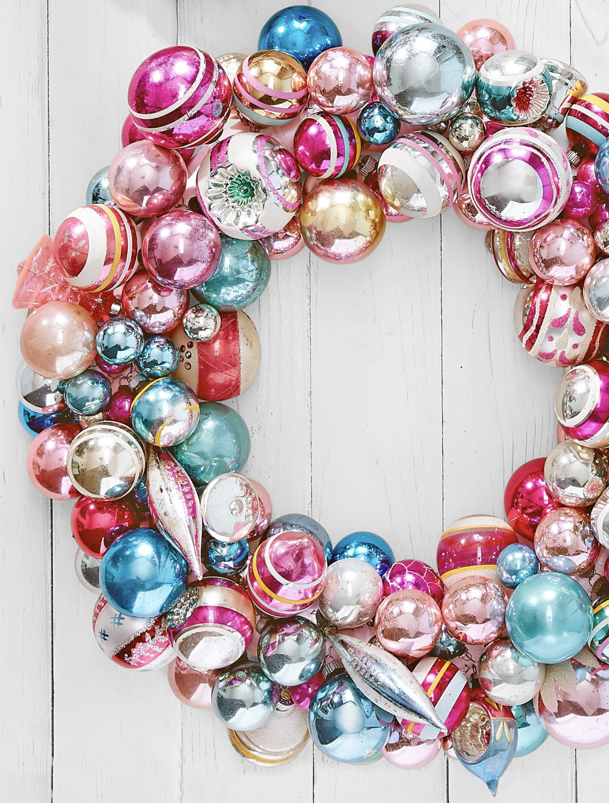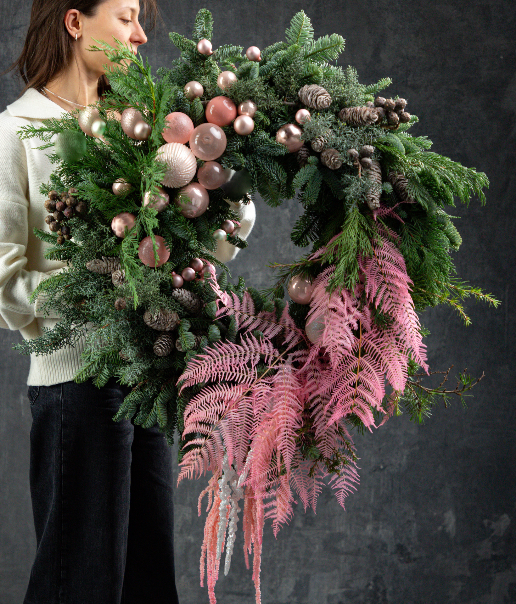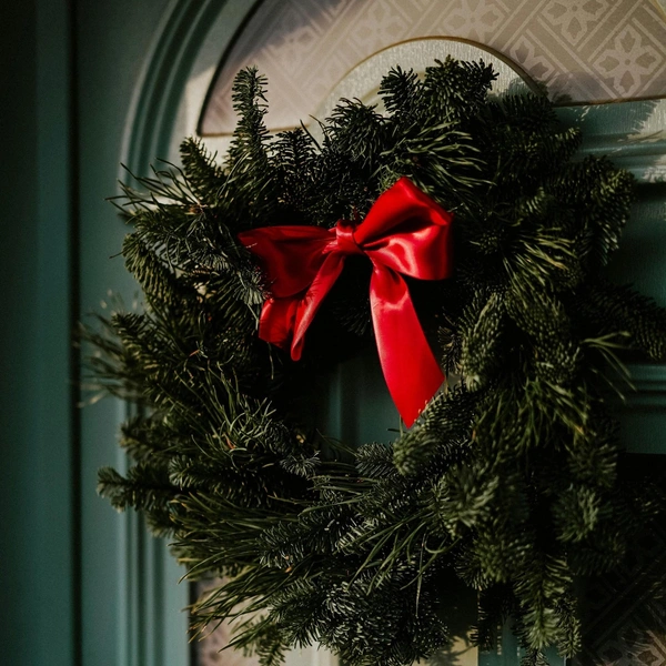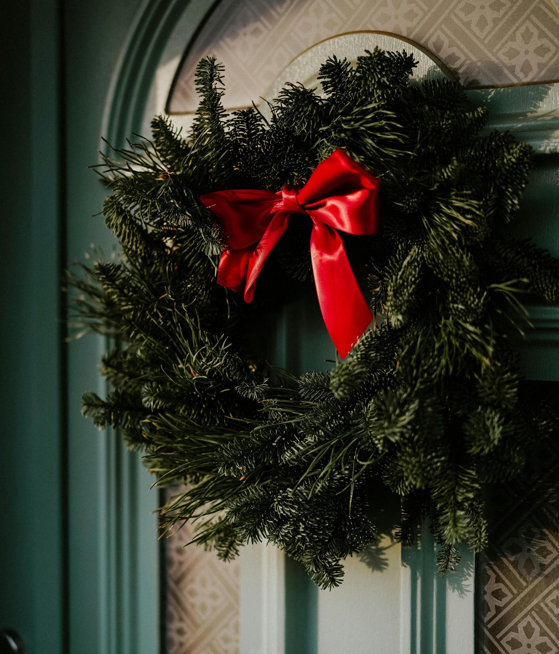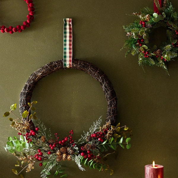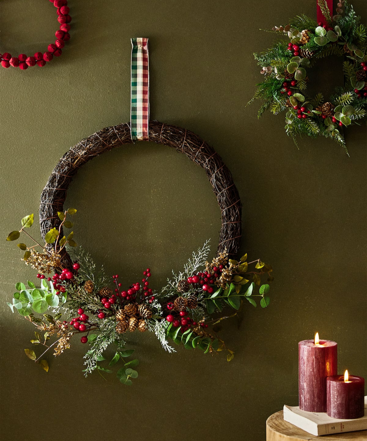 Венок — прекрасный способ использовать новогодние украшения и большие бархатные банты, когда нет елки, на которую их можно повесить. Если у вас есть целая свободная стена, можно сгруппировать несколько венков.