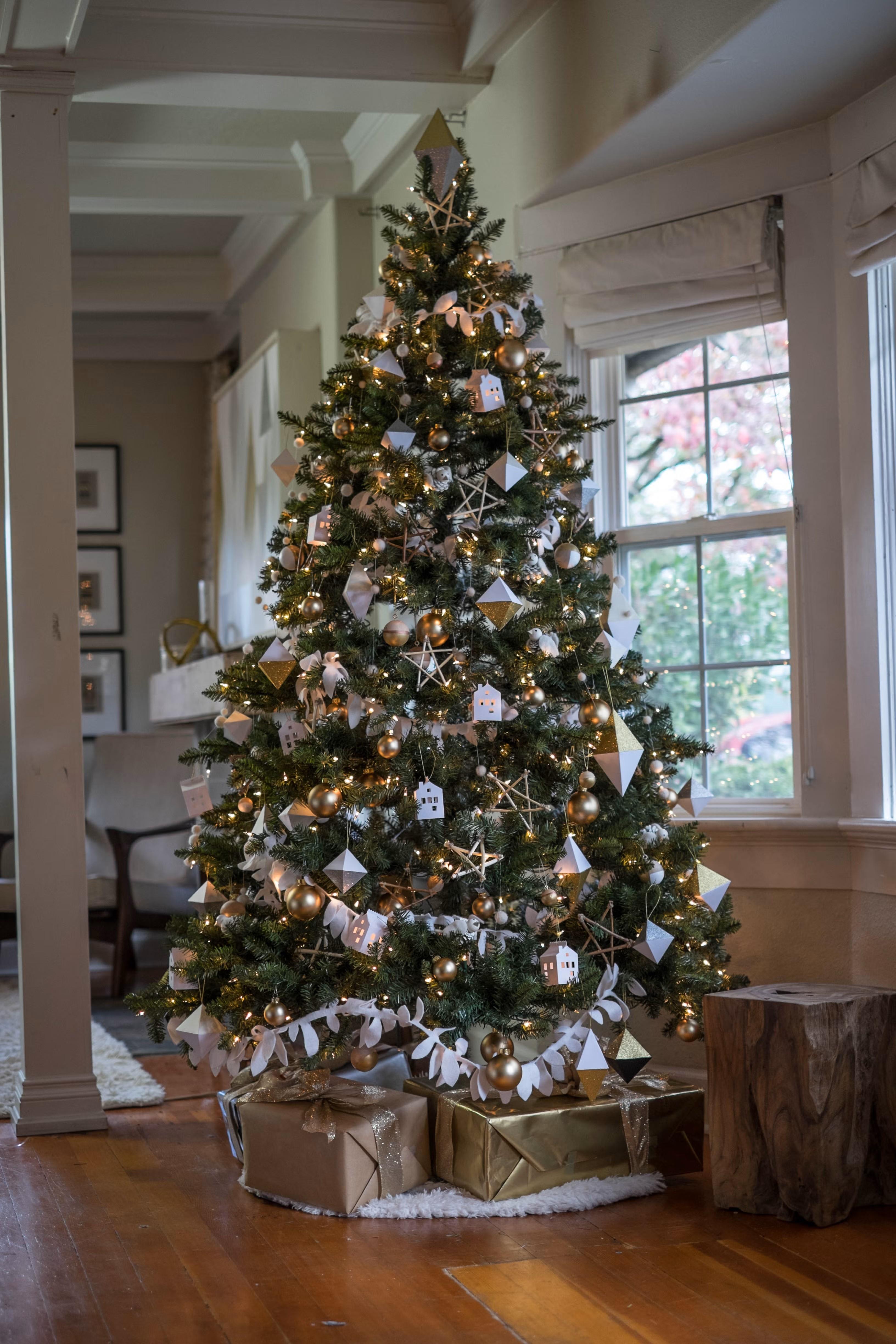 Если ваша елка не предварительно освещена, первым делом добавьте подсветку. Общее правило: около 100 лампочек или 5 метров гирлянды на каждые 60 см высоты дерева. Начинайте от ствола у основания: обмотайте его, затем двигайтесь вверх, пропуская гирлянду змейкой ближе к центру, а на обратном пути — ближе к кончикам веток. Чередуйте положение лампочек (под веткой, над веткой) для равномерного сияния.