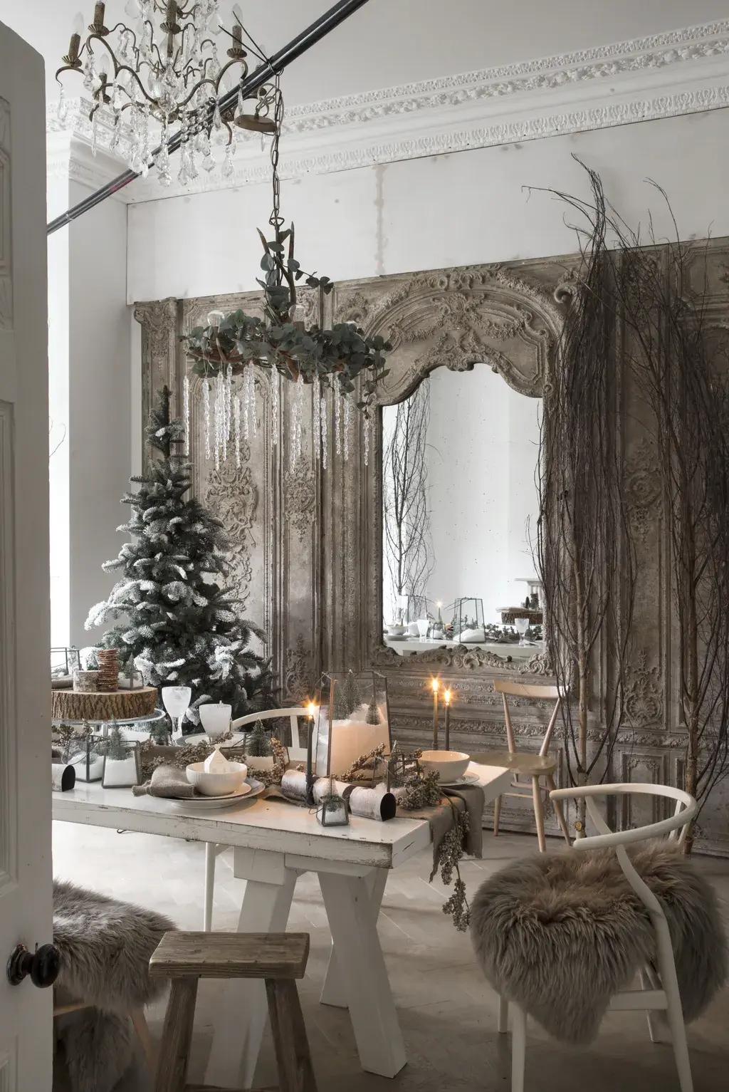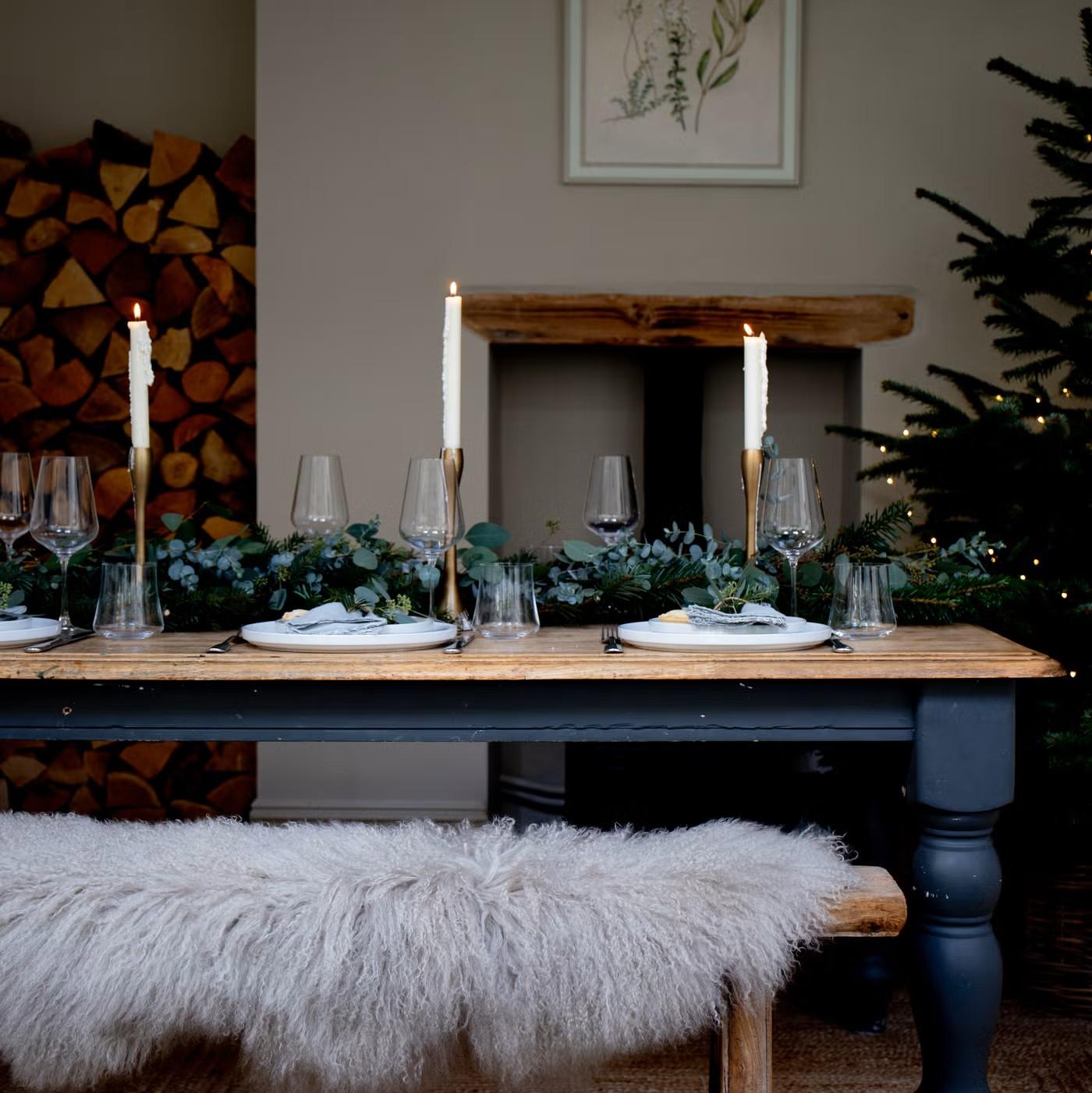 Часто пространство над столом остается пустым, а ведь это отличная возможность для декора. Подвесная композиция из веток, большой венок или гирлянды создадут ощущение уютного праздничного шатра. Добавьте несколько тонких свечей разного цвета для большего эффекта.