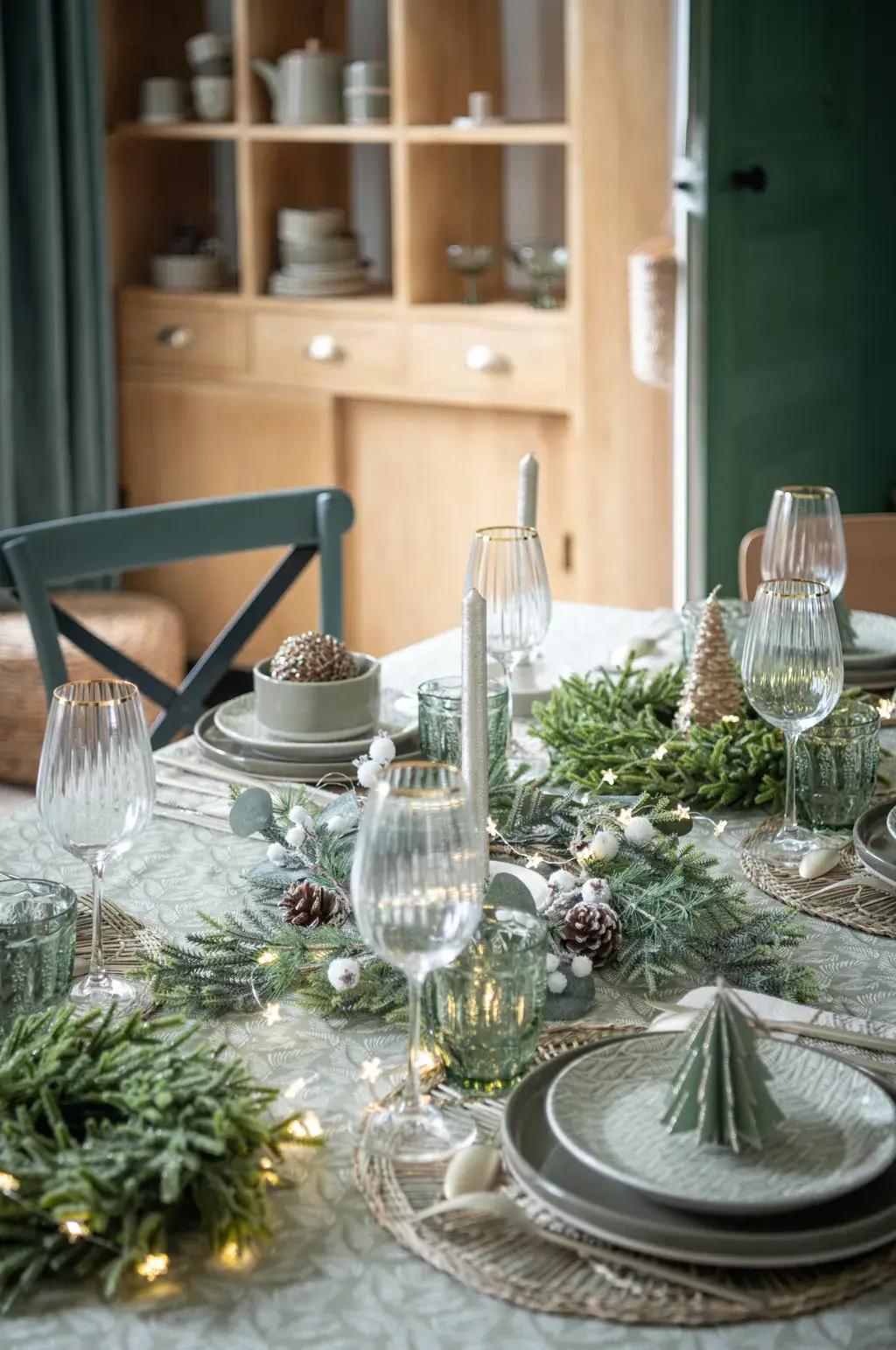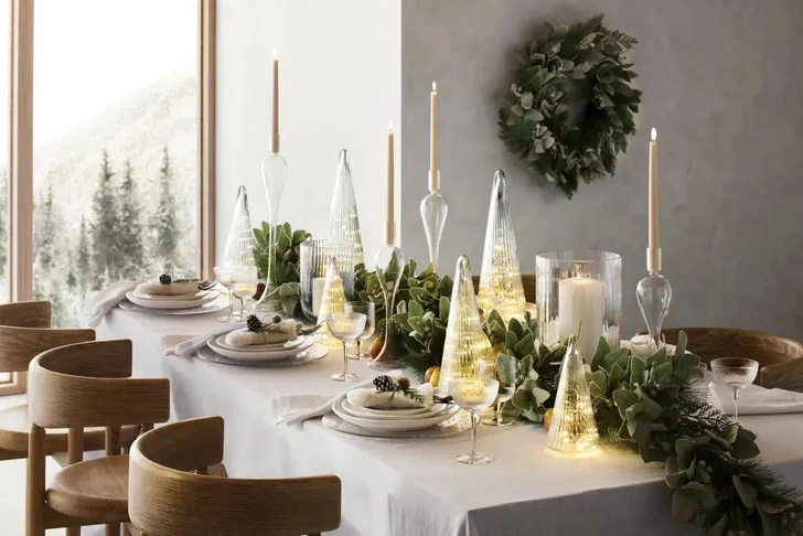 Вместо одного центрального украшения можно выстроить вдоль всего стола композицию из маленьких елочек, хвойных веток и свечей. Разная высота свечей и оттенки зелени сделают картинку живой и интересной. Можно использовать и длинную гирлянду, закрепив ее подсвечниками.