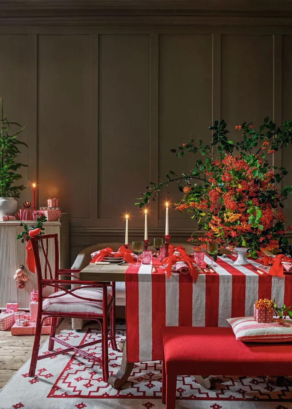 Традиционные новогодние цвета можно подать современно и с характером. Например, накройте стол красно-белой полосатой скатертью и дополните необычным украшением из веток с ягодами. Такой подход соединяет знакомую с детства атмосферу с актуальной эстетикой.