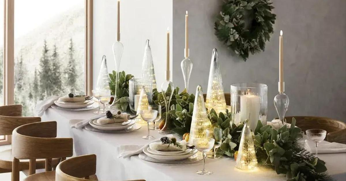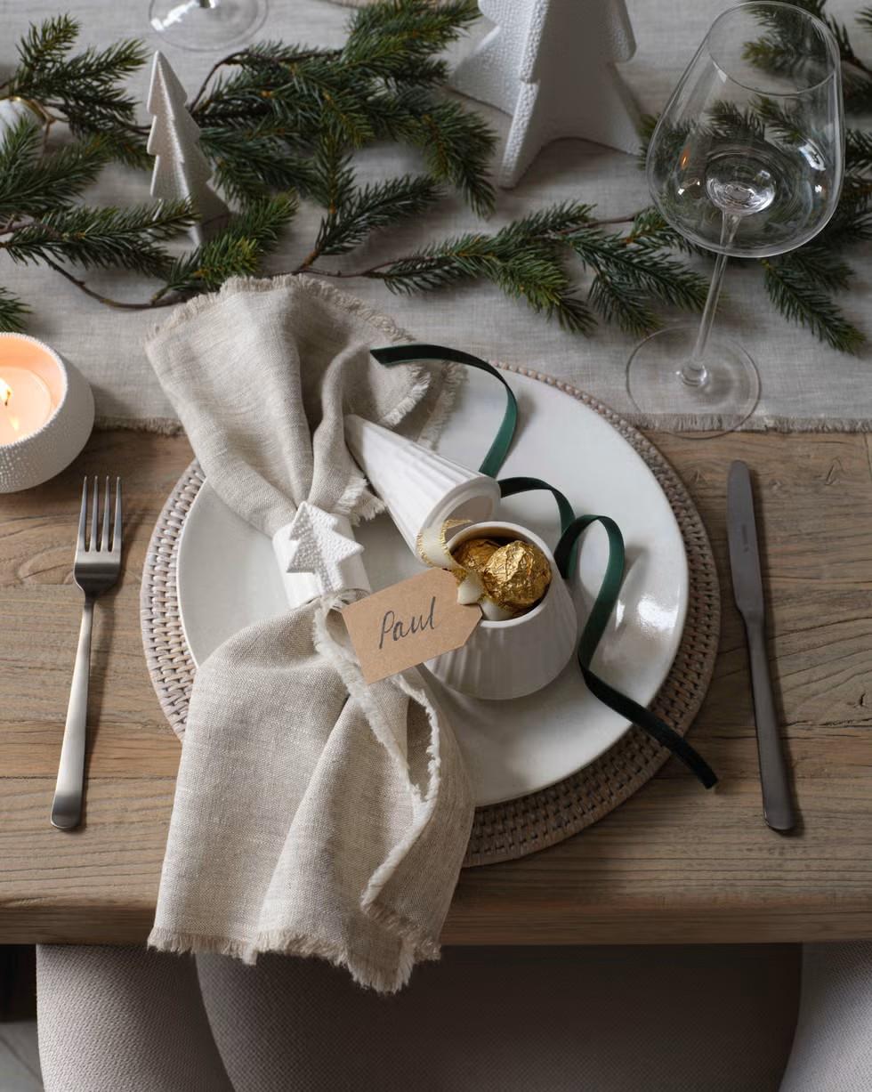 Несколько миниатюрных елочек на столе — беспроигрышный символ праздника. Их можно поставить в центре, возле каждого прибора или и там и там. Это бюджетный и очень нарядный способ украшения.