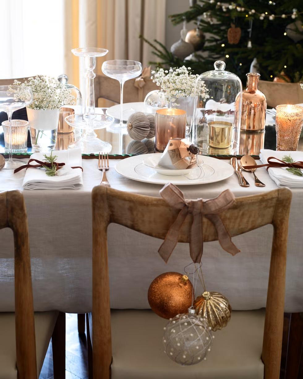 Стулья тоже должны быть нарядными. Небольшой бант, маленький венок или просто веточка хвои на спинке каждого стула — эта небольшая деталь завершит образ и свяжет всю композицию воедино.
