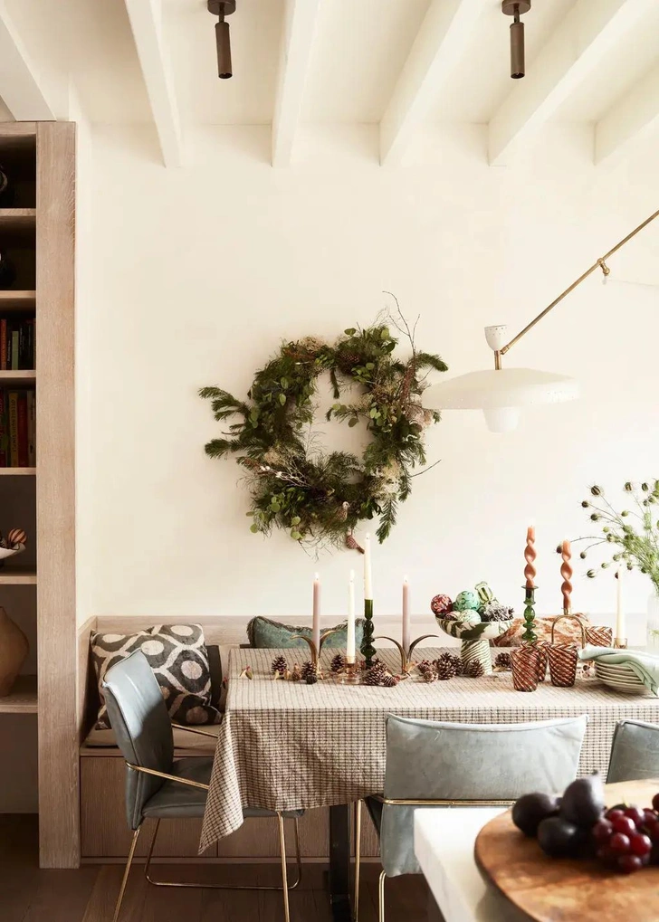 Крупный праздничный венок над обеденной зоной сразу задает тон всему пространству. Дополните его шишками, свечами и вазой с шарами — получится законченная праздничная картина.