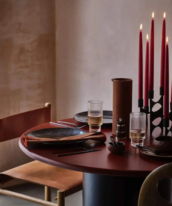 Не обязательно создавать сложные композиции. Иногда одного красивого акцента вполне достаточно. Например, стильный подсвечник с красными свечами на нейтральном фоне смотрится лаконично и очень празднично.