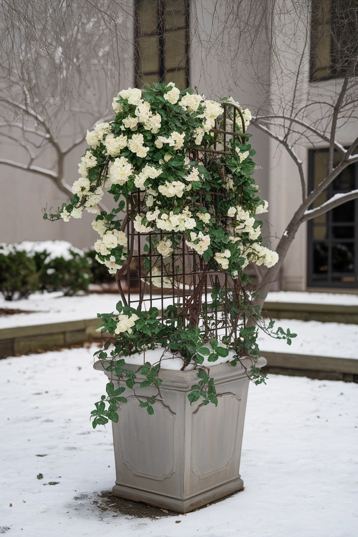 Кустарники можно обвязать мешковиной для защиты от ветра и тяжелого снега. Большие уличные кадки, которые невозможно занести, стоит утеплить, обернув сам горшок пузырчатой пленкой, войлоком или мешковиной.