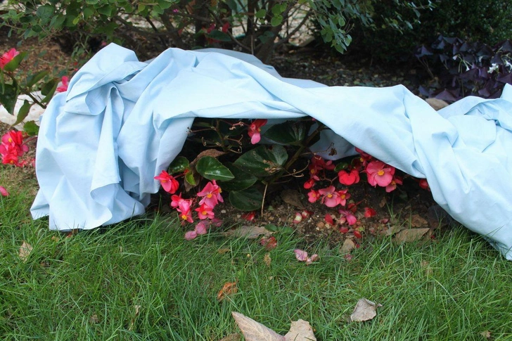Для уязвимых садовых растений используйте специальный агротекстиль (спанбонд, лутрасил), мешковину или обычные тканые материалы — старые простыни, одеяла, покрывала. Накройте растения, чтобы материал не касался листьев, и закрепите края камнями или землей.