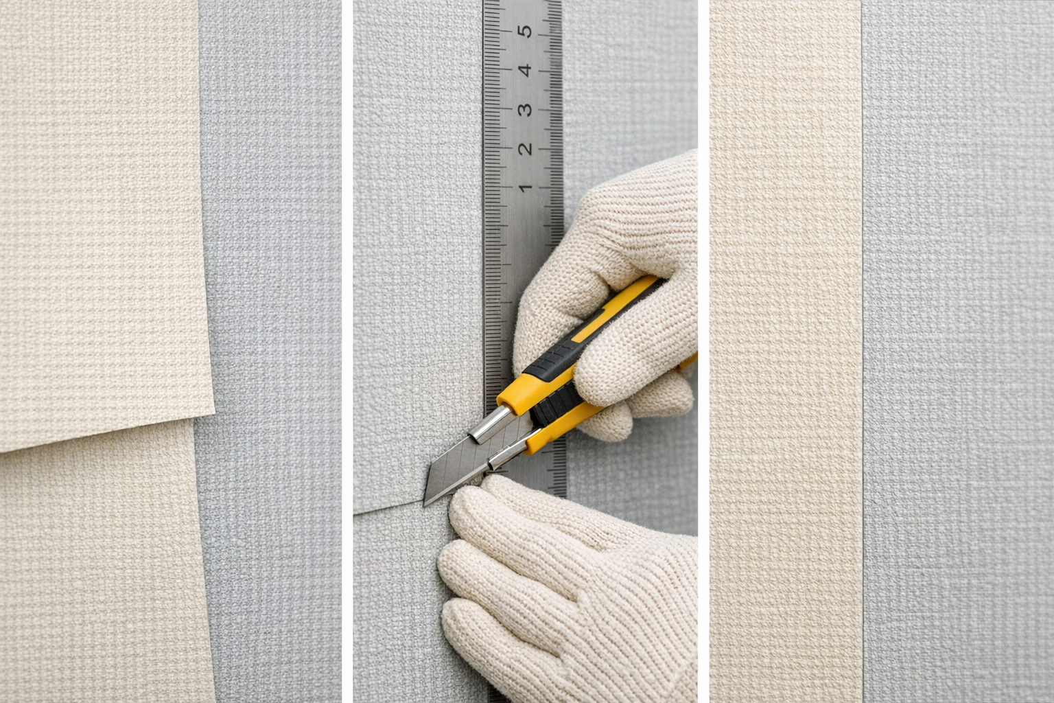 Стыки подрезайте по месту. Особенно на кривых стенах лучше делать подрезку «двойным резом», а не надеяться на заводскую геометрию рулона.