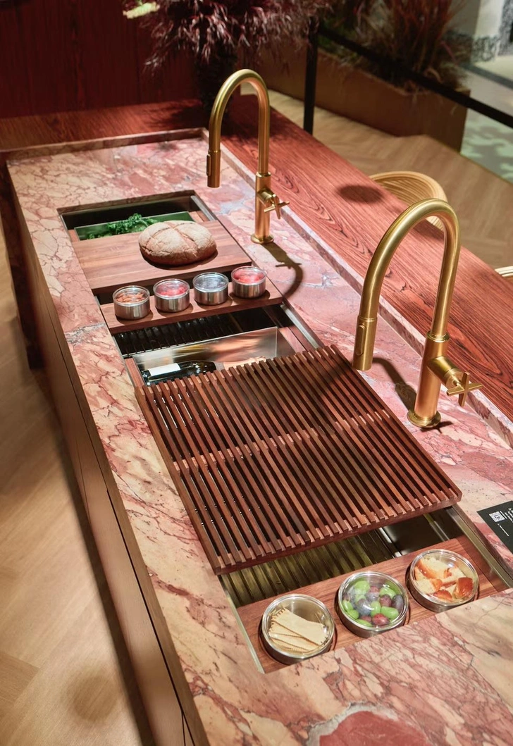 Такие мойки, по мнению их создателей, помогут наладить разные кухонные сценарии. Больше всего, пожалуй, им будут рады те, у кого достаточно компактная кухня и не так много рабочих поверхностей. Кроме того, что обычно делают в мойке, здесь можно поставить доску и резать овощи, ставить кастрюли, легко сливать воду и мыть овощи. А еще тут есть два смесителя — можно не толкаться, если кому-то нужно помыть себе, например, яблоко, пока другой занят мытьем кастрюли.
