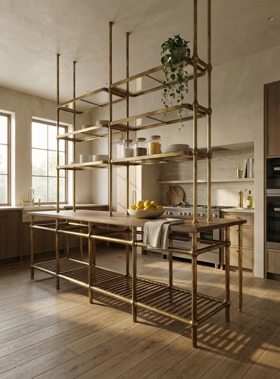 И растет не вширь, а ввысь. Если закрытого хранения не хватает, можно «вырастить» несколько этажей открытых полок прямо на кухонном острове. Из плюсов — никакого загромождения фасадами, все на виду, из минусов…да, все вещи на виду выглядят не всегда красиво. Тем не менее, можно присмотреться к тому, что сделали Worthen Furniture: это система Taboret Tray из латуни.