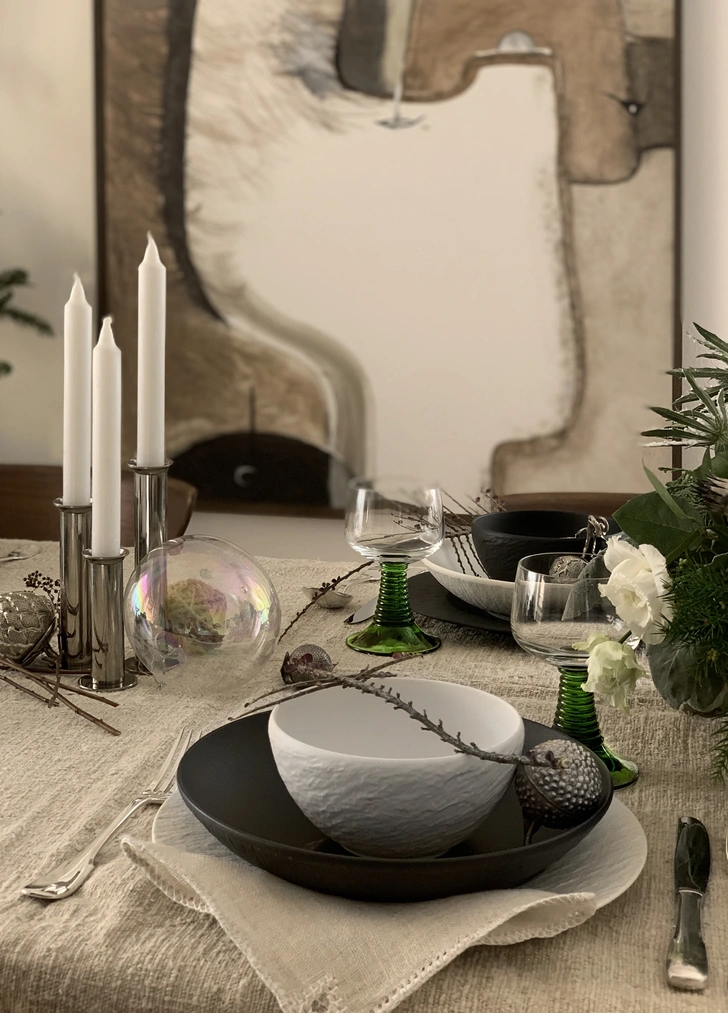 Праздничный ужин — это не только тарелки и приборы. Хрустальные вазочки могут быть отличной декоративной основой. Они подходят для зимних флористических композиций: еловых веточек, хлопка, рябины, гипсофилы или сухоцветов с эффектом инея. Благодаря оптическим свойствам материала, растения выглядят объемнее и выразительнее — как будто рассматриваешь их через прозрачную линзу. Усилить эффект можно небольшой светящейся гирляндой, расположив ее на дне.