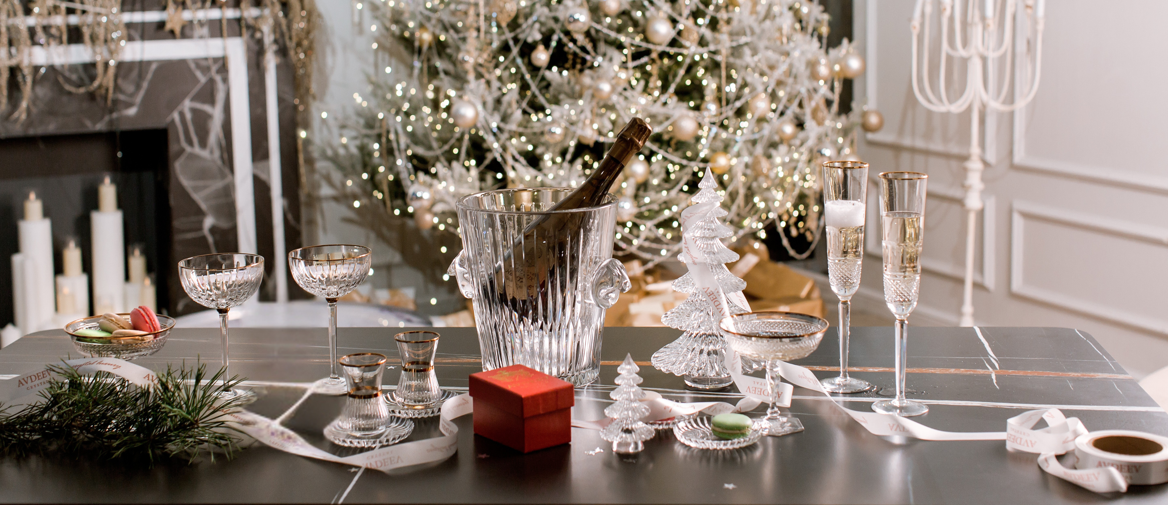 В сервировке хрустальные изделия становятся самостоятельными декоративными элементами. Бокалы на высокой ножке с широкой чашей задают визуальный ритм, огранка и металлическая окантовка — золотая или серебряная — создают тонкий блеск, который легко вписывается и в спокойную классику, и в атмосферу ар-деко с его световыми акцентами и графичностью.