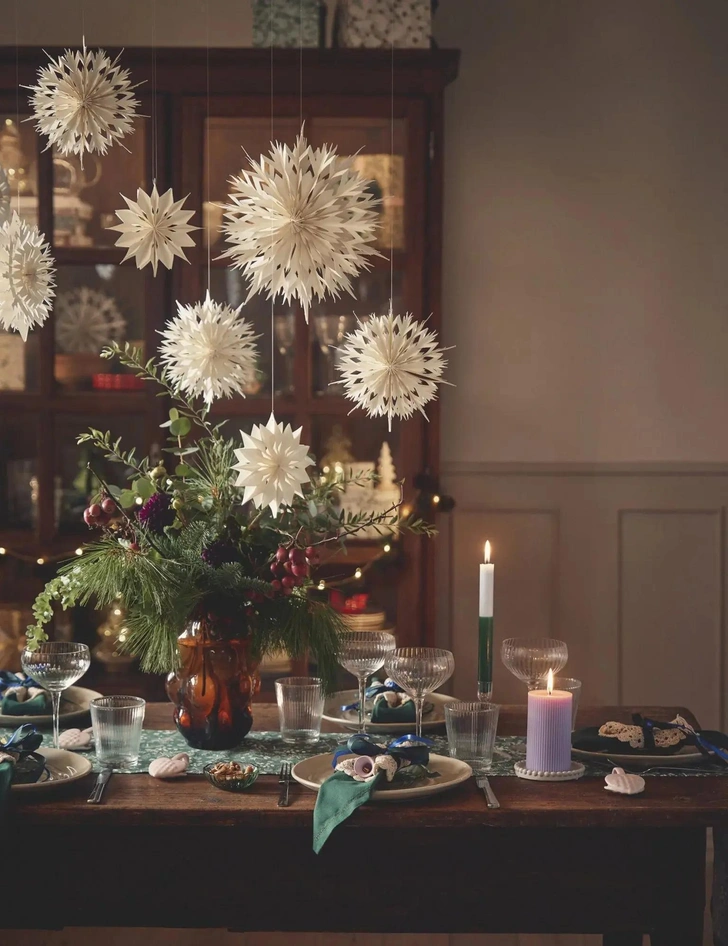 Свечи — самый выразительный способ подчеркнуть красоту хрусталя. С ними каждая грань оживает, создавая мягкое мерцание. Чтобы пространство выглядело целостно, свечи стоит расставить и за пределами обеденного стола. Они прекрасно смотрятся на комоде, журнальном столике или открытой кухонной полке. В сочетании с небольшими декоративными фигурками из хрусталя — елочками, снеговиками или зайцами — пространство наполняется атмосферой зимней сказки.