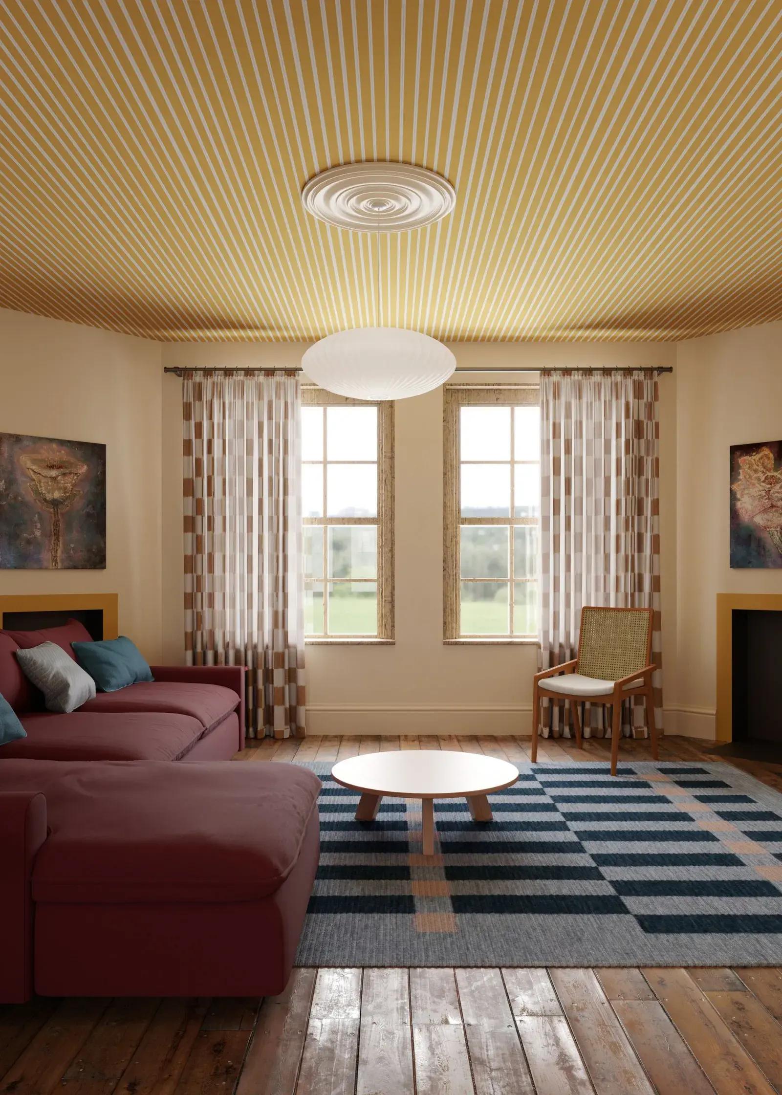Кажется, ни для кого уже не секрет, что клеить обои можно не только на стены, но и на потолок. Посмотрите, как эффектно это выглядит с полосатым принтом — он будто погружает комнату в оптическую иллюзию, играя с восприятием. Особенно интересно такой прием будет смотреться в помещениях с интересной архитектурой.