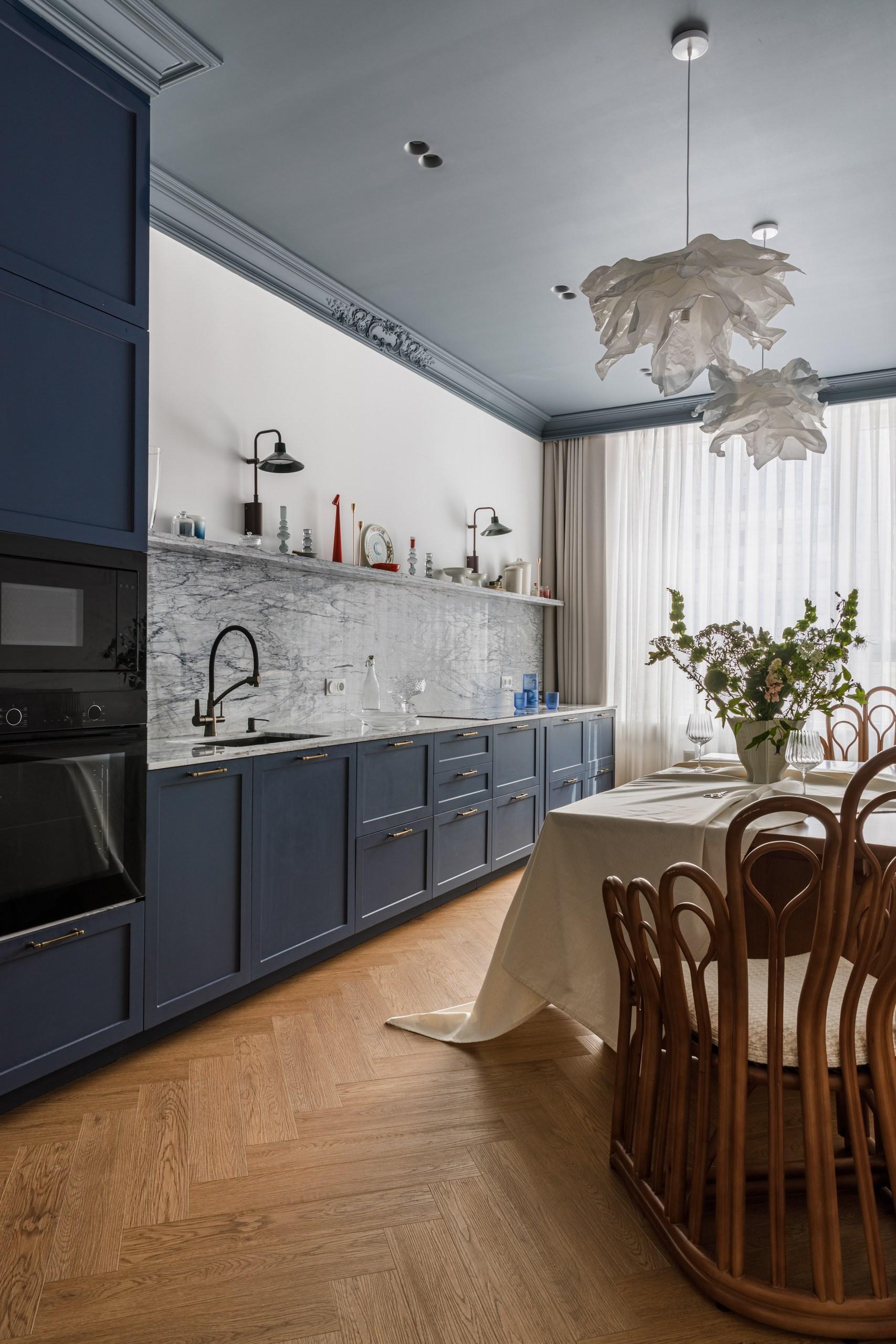 В собственной квартире дизайнер Айбике Смагулова воплотила все самые смелые решения, которые когда-то не позволяли реализовать заказчики. Среди них были и потолки, крашенные в терракотовый и глубокий синий. Проект вдохновлен французской классикой, поэтому потолки дополнительно украсили лепниной.