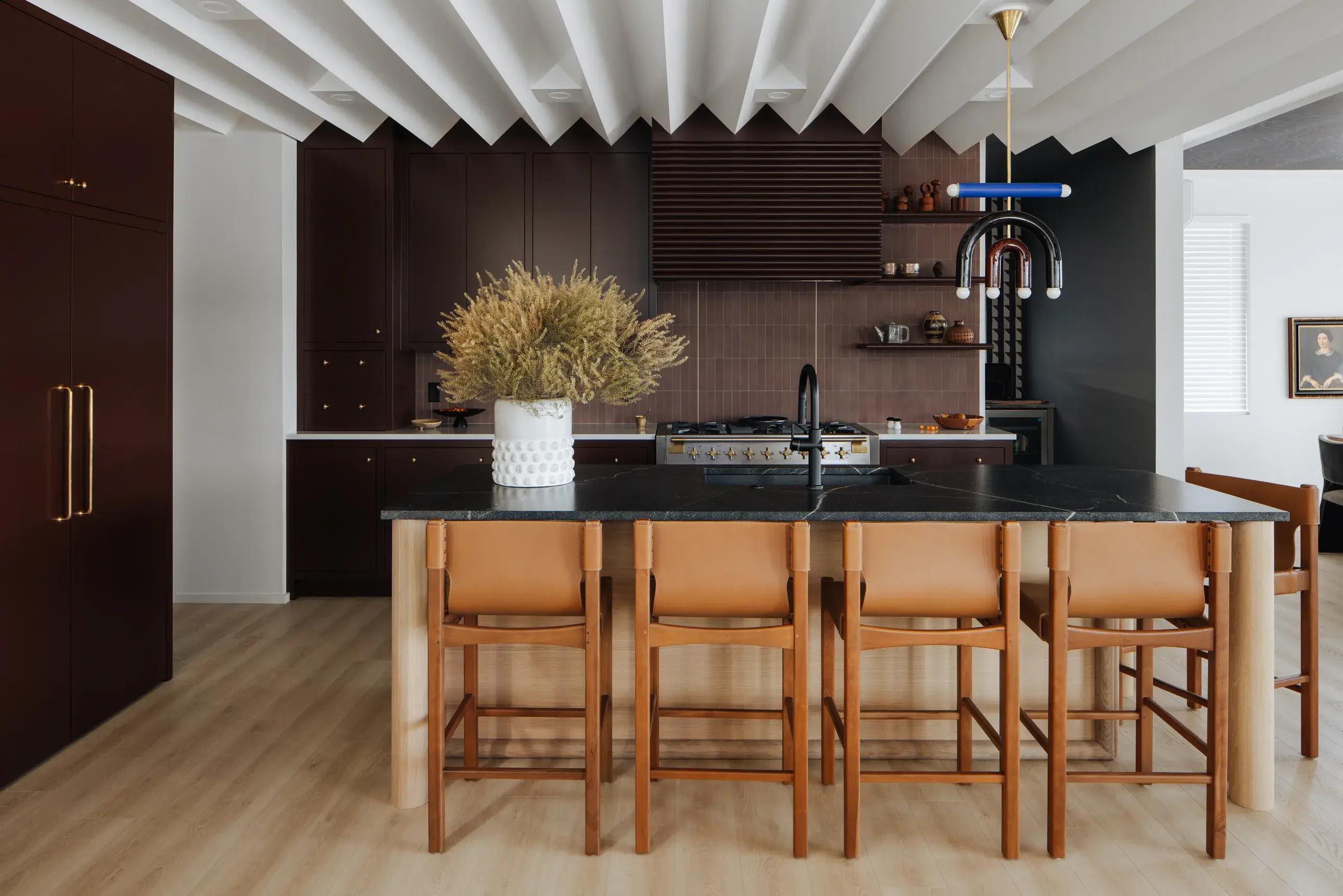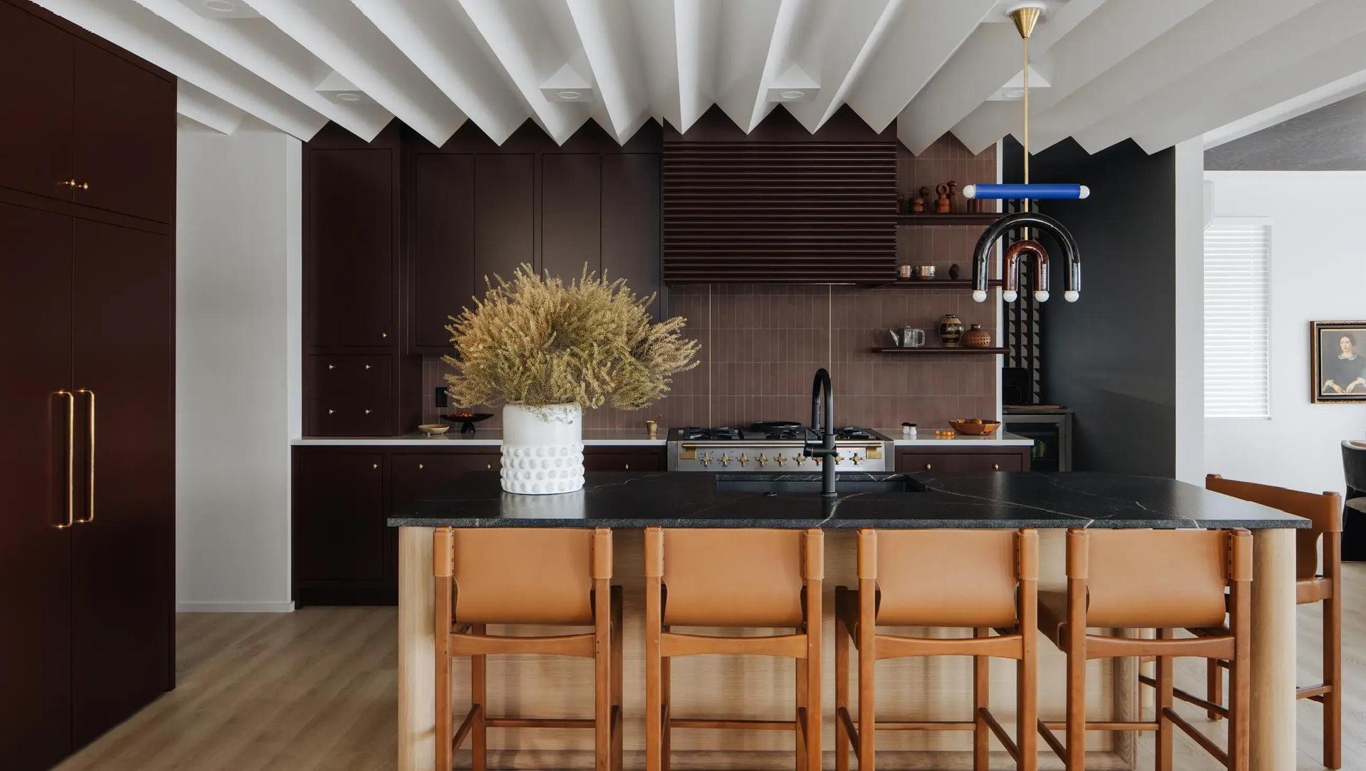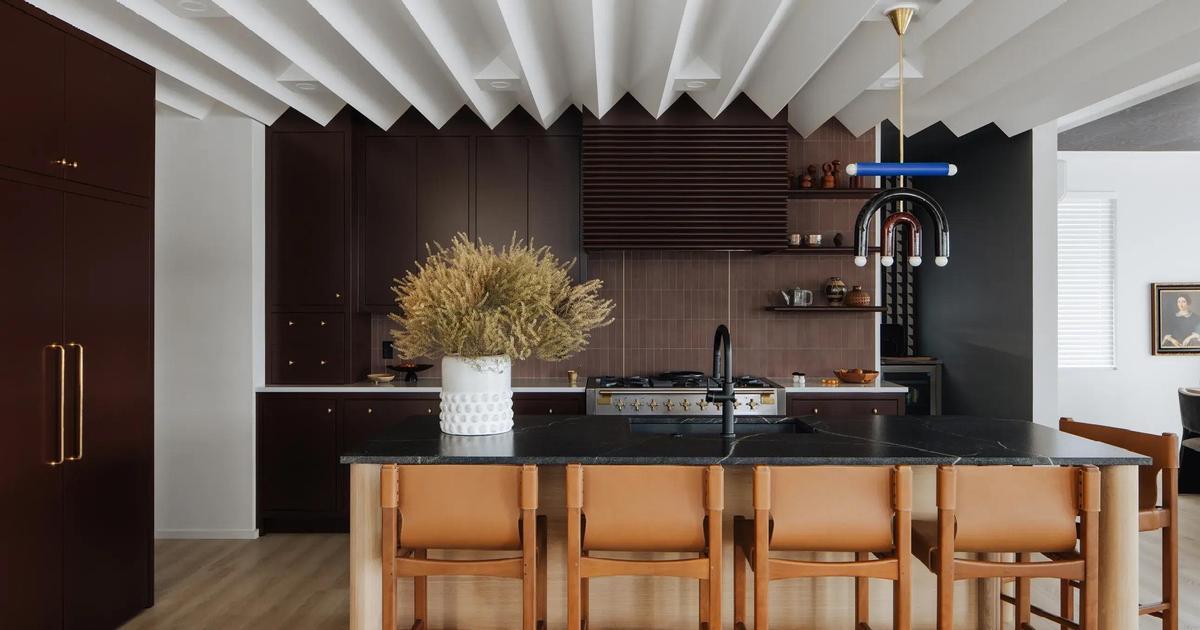Для дизайнера Лиз Хокземы (Liz Hoekzema) в этом проекте не было и речи об однотонном скучном потолке. Кухня дома в Мичигане стала местом для реализации любопытной идеи: геометричных складок. Они были созданы командой плотников и окрашены в классический серый. Продуманная форма потолка создает любопытную игру света и тени в пространстве.