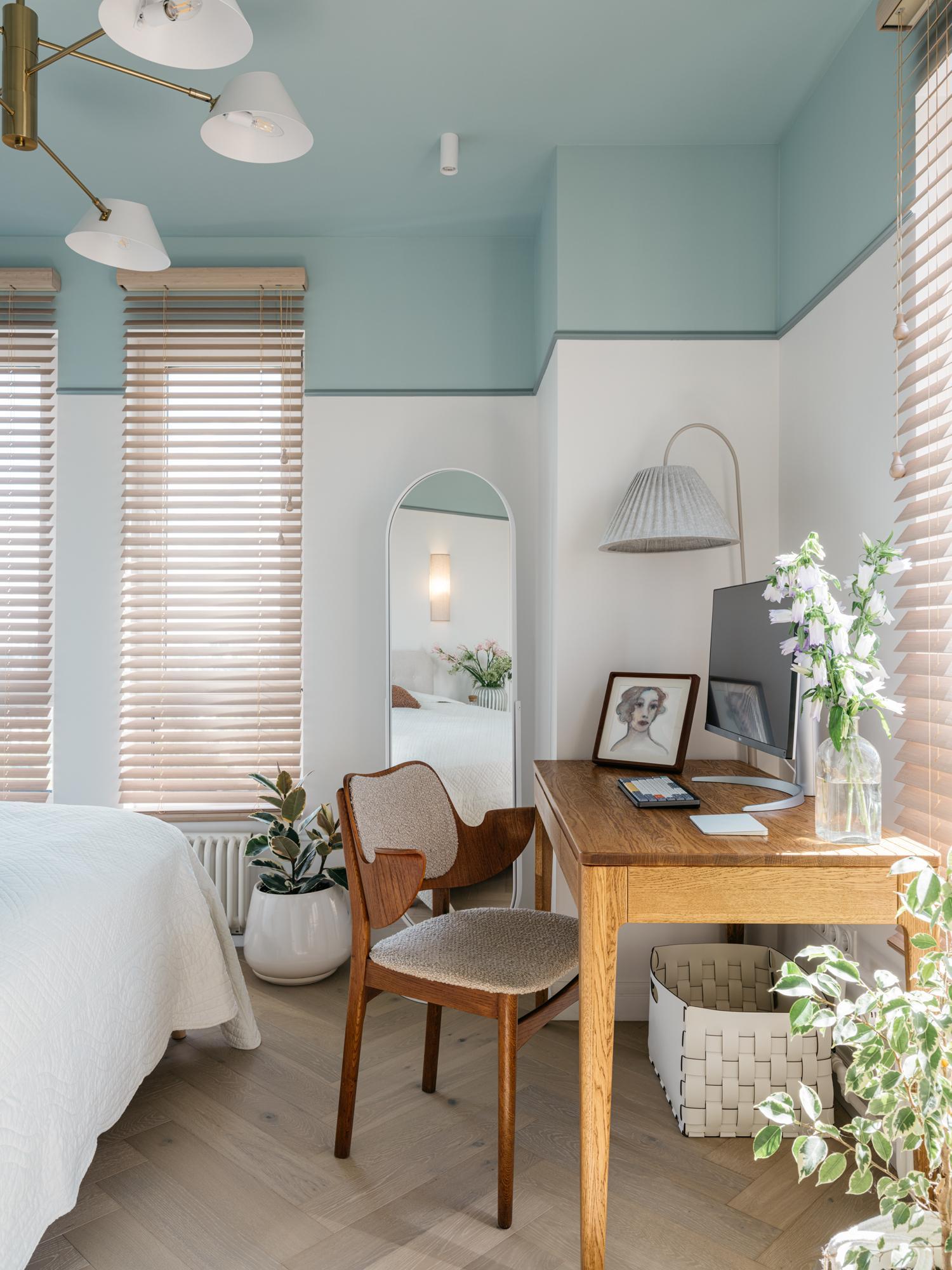 Несмотря на скромную высоту потолков (2,5–2,6 м), в этом проекте квартиры для молодой пары дизайнер Мария Ткачук решилась на смелый прием — цветной потолок в спальне. Это решение шло вразрез с традиционными рекомендациями для небольших пространств, но интуиция не подвела: потолок стал главным героем комнаты. «Цвет — один из самых доступных инструментов выразительности, особенно при ограниченном бюджете, и я решила воспользоваться им в полной мере», — говорит Мария.