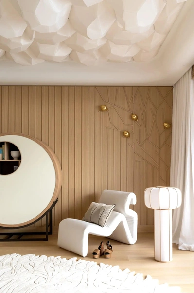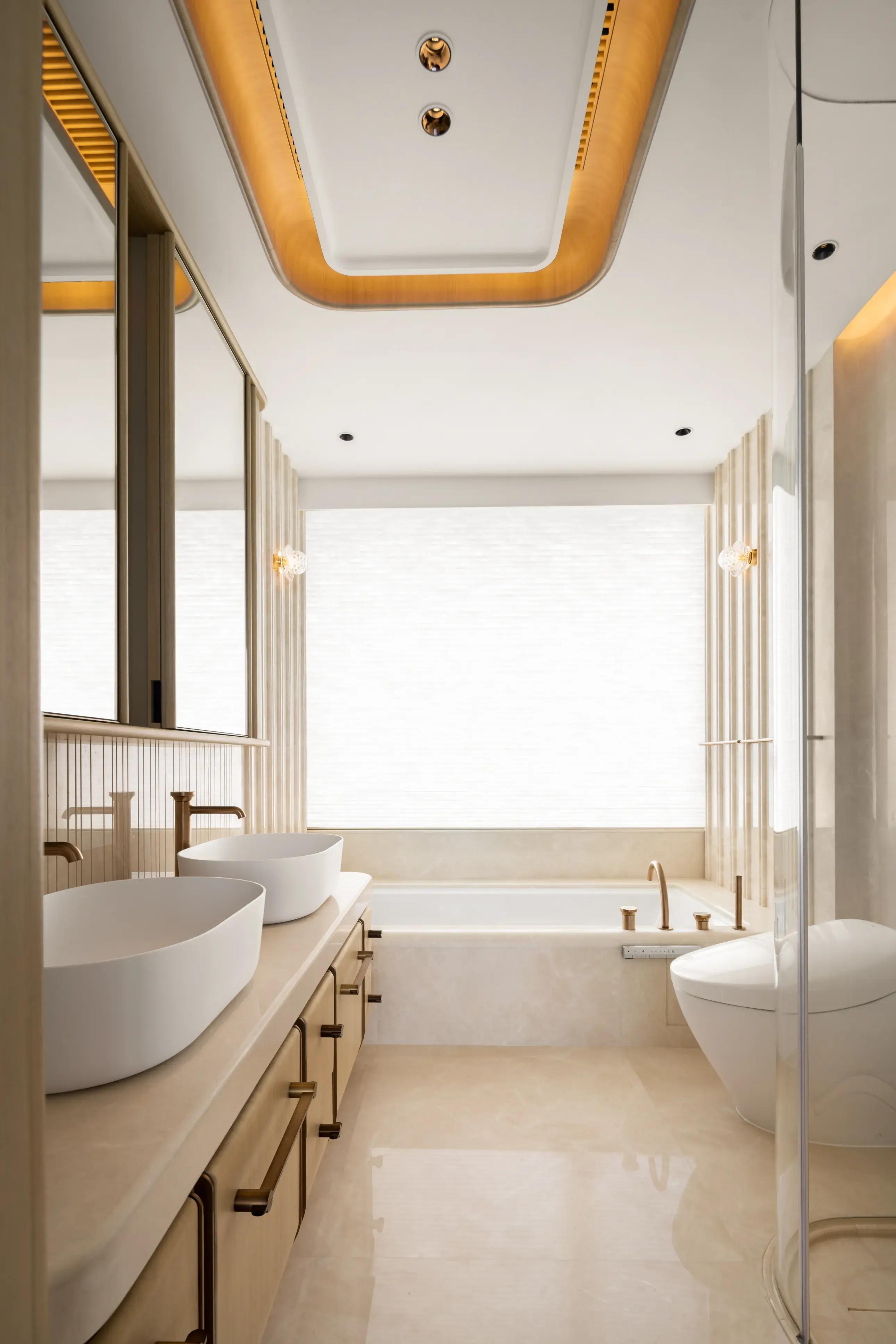 «Потолок часто остается самой сдержанной поверхностью, однако он способен стать важным финальным штрихом пространства», — говорит гонгконгский дизайнер Клемент Ченг (Clement Cheng). В этом проекте изготовленный на заказ яркий светильник в ванной контрастирует с нейтральными оттенками потолка, пола и ванны.