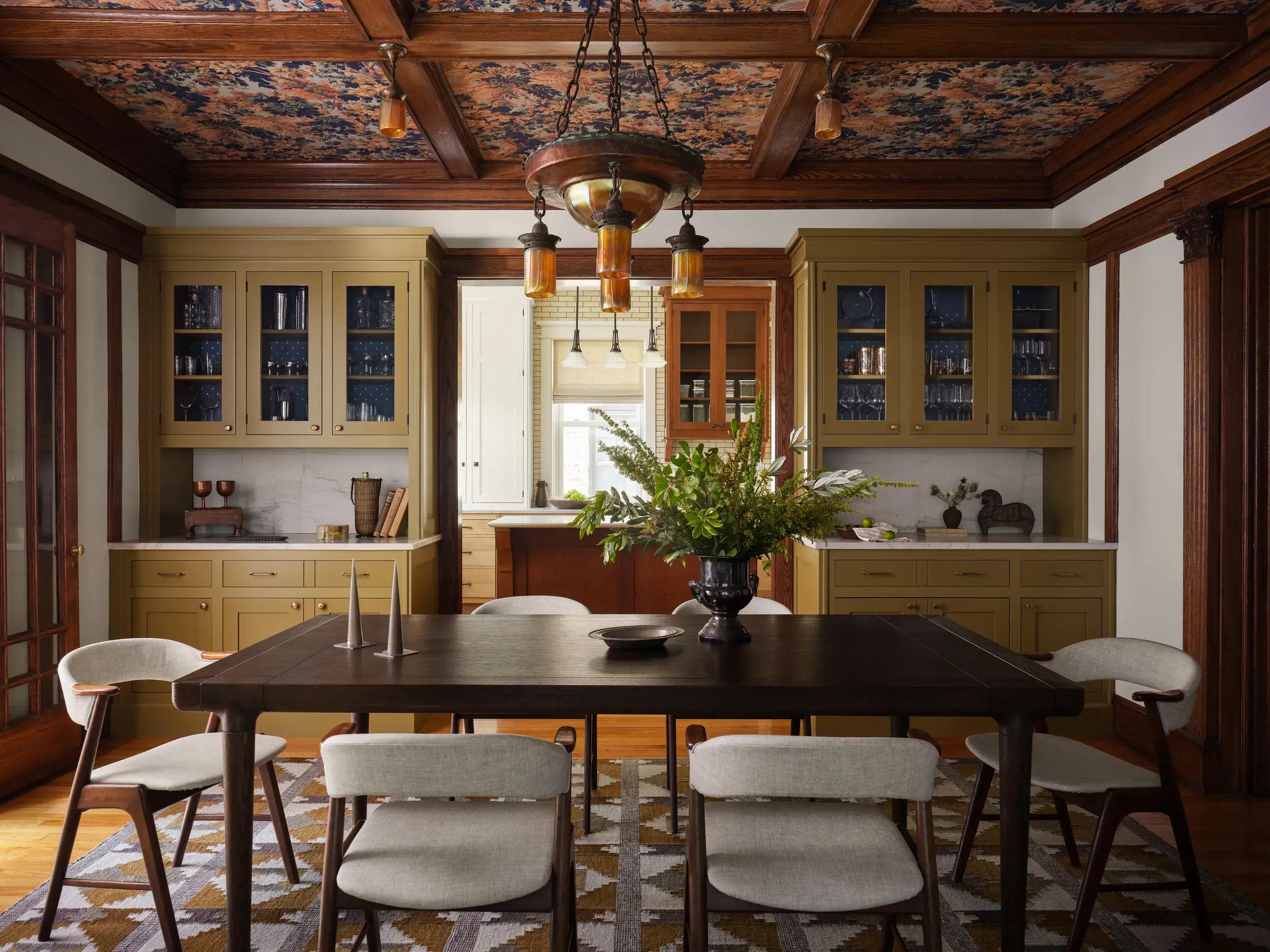 Для дизайнера Сары Монтгомери обновление старинного кирпичного дома 1914 года стало возможностью объединить исторические элементы с эклектичными аксессуарами и благородными оттенками. Обновленный светильник столовой теперь выделяется на фоне ботанического принта обоев Pierre Frey на потолке — это «легкое и эффектное решение», отмечает Монтгомери. Еще одну частично сохранившуюся историческую деталь, шкафы O'Brien Harris, заново окрасили яркой краской.
