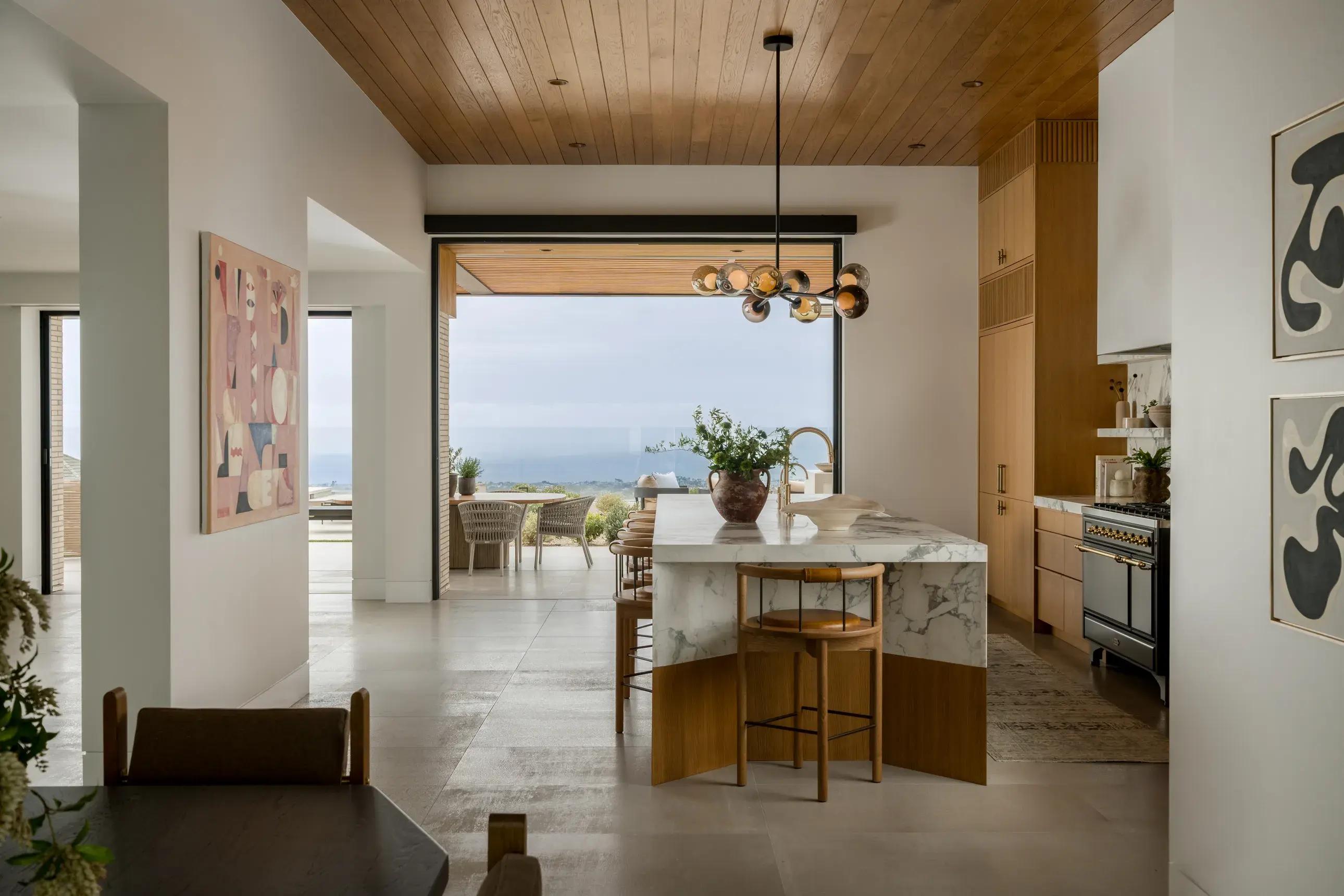 Интерьер калифорнийского дома от дизайнера Эрики Марини (Erica Marini) демонстрирует ее любовь к чистой, современной архитектуре и использованию натуральных материалов. Она выбрала для этого проекта известняковые полы и дубовый потолок: так получилось роскошное, но не вычурное пространство, где в любой момент можно устроить вечеринку.