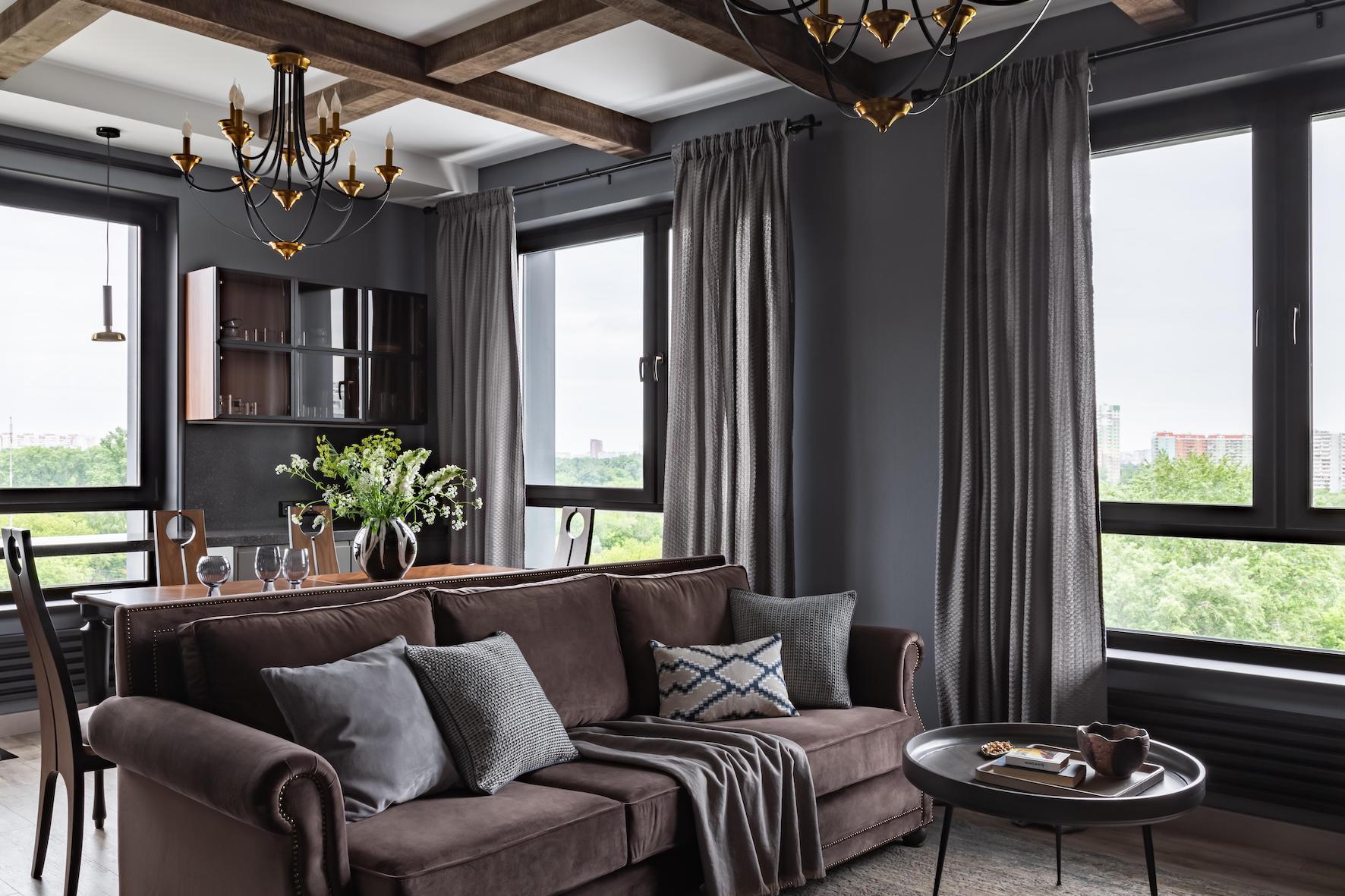 В этом проекте дизайнер Татьяна Романова решила смешать разные стили: здесь звучат отголоски неоклассики, лофта, минимализма и даже немного переосмысленной готики. В гостиной, где потолок оставили максимальной высоты, решили сделать балки — заказали шпонированные модели с интересной состаренной текстурой.
