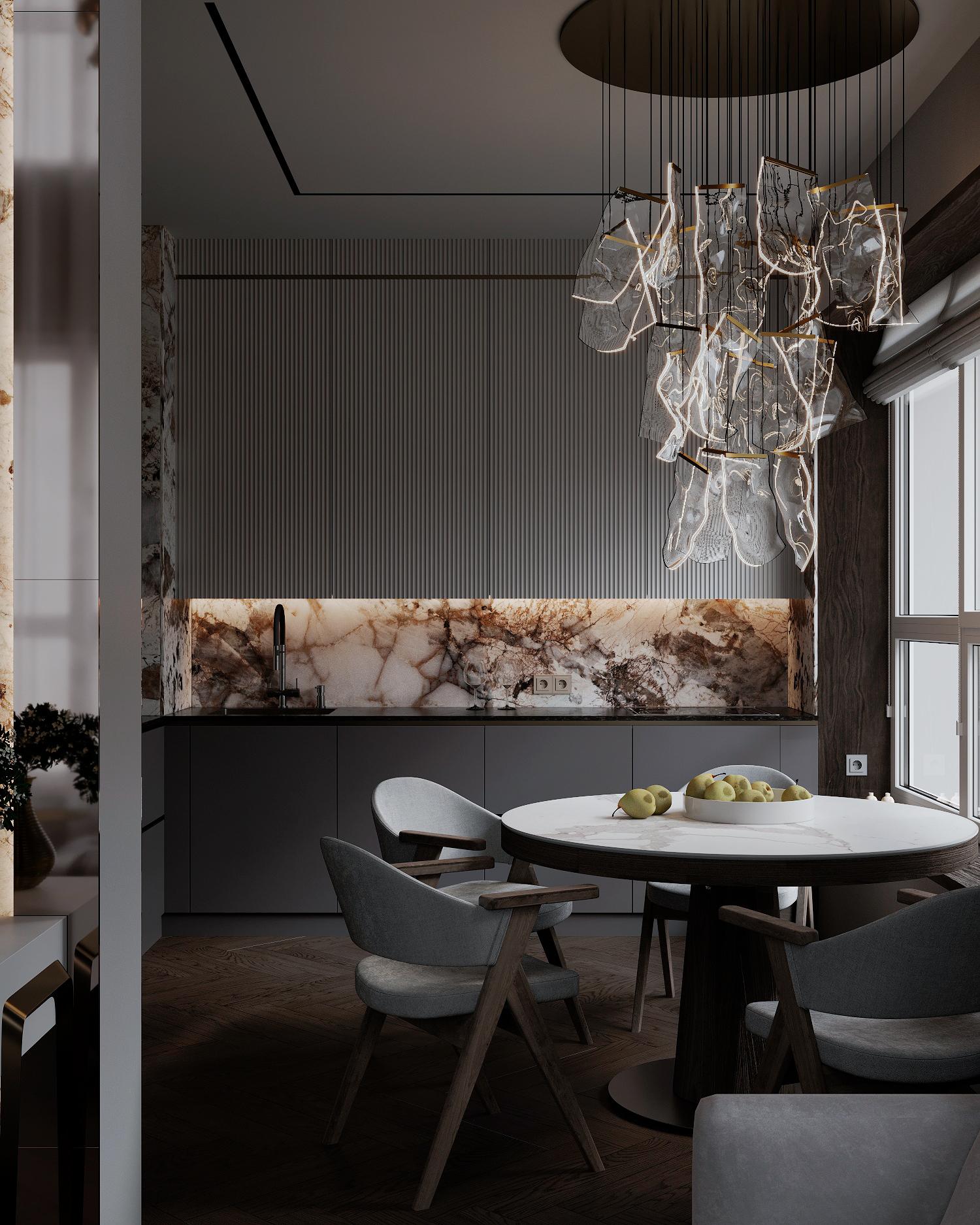 Зеркала получили двойной контур — декоративный и рабочий, чтобы утренние сборы не зависели от капризов верхнего света. На кухне нейтральный, равномерный поток под шкафами заменил традиционное освещение. На кухне важна хорошо освещенная рабочая зона. Это и для здоровья важно, потому что мы готовим и зрение концентрируется на буквально на одной точке. Над обеденным столом разместили источник света теплого оттенка, создающий атмосферу уюта.