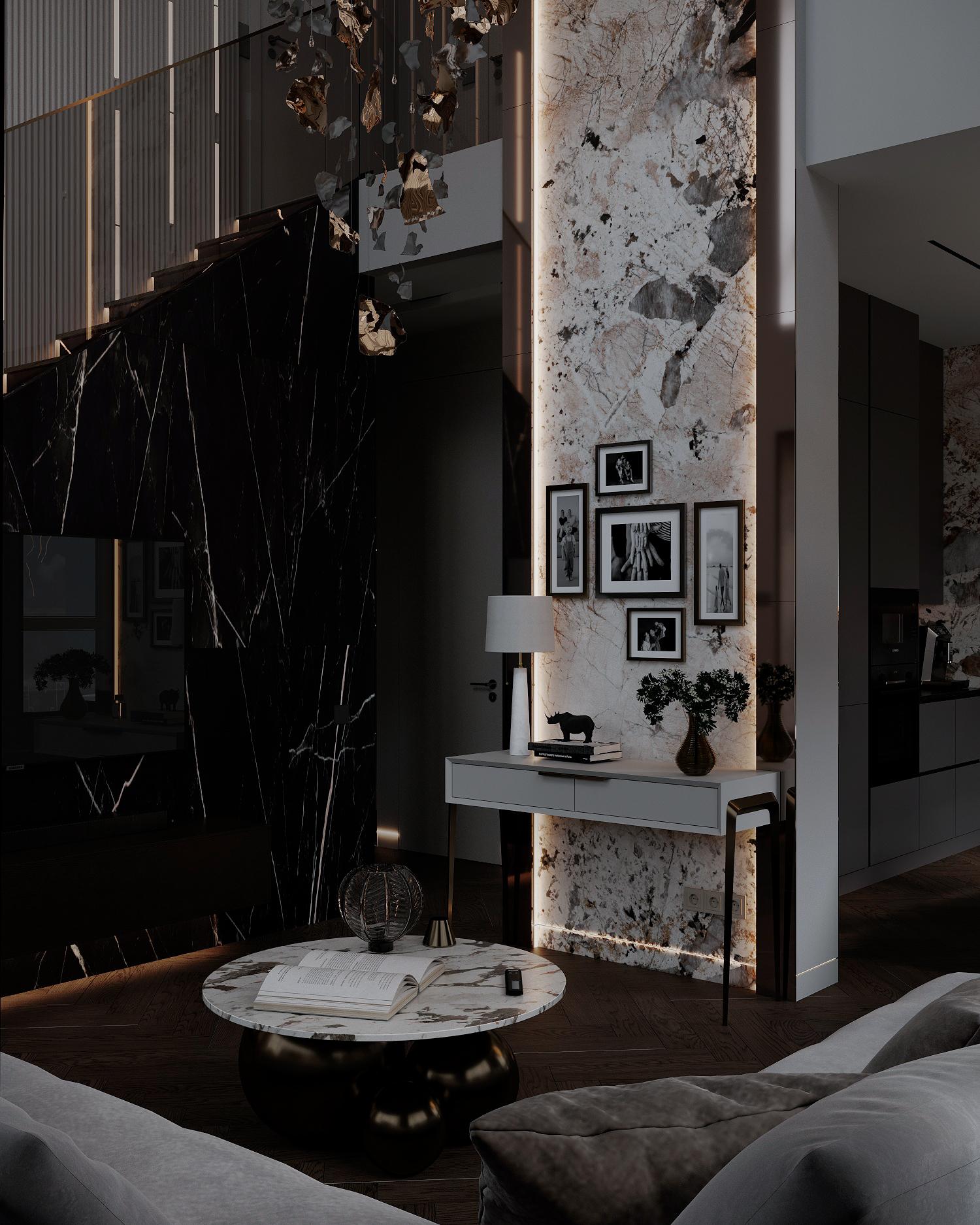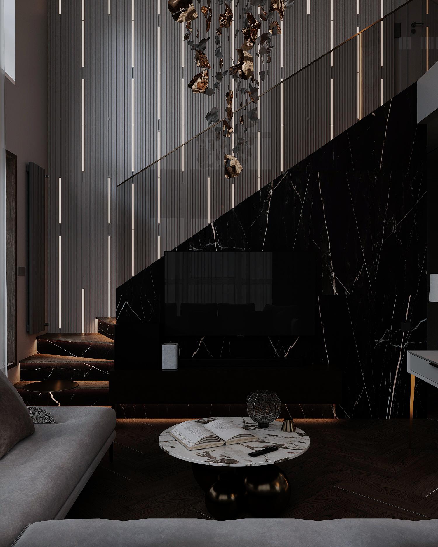 Отдельная тема для подсветки — лестничные марши. Тонкая линия вдоль проступей, включающаяся от движения, становится и гарантией безопасности, и сценографией. Стены над подъемом можно «оживить» легкими световыми панелями: не прожекторами, а именно рассеянными пластинами, подчеркивающими высоту и ритм. Там же уместны подвесы-«струны», уходящие с потолка вниз, их вертикаль собирает пространство и ведет взгляд.