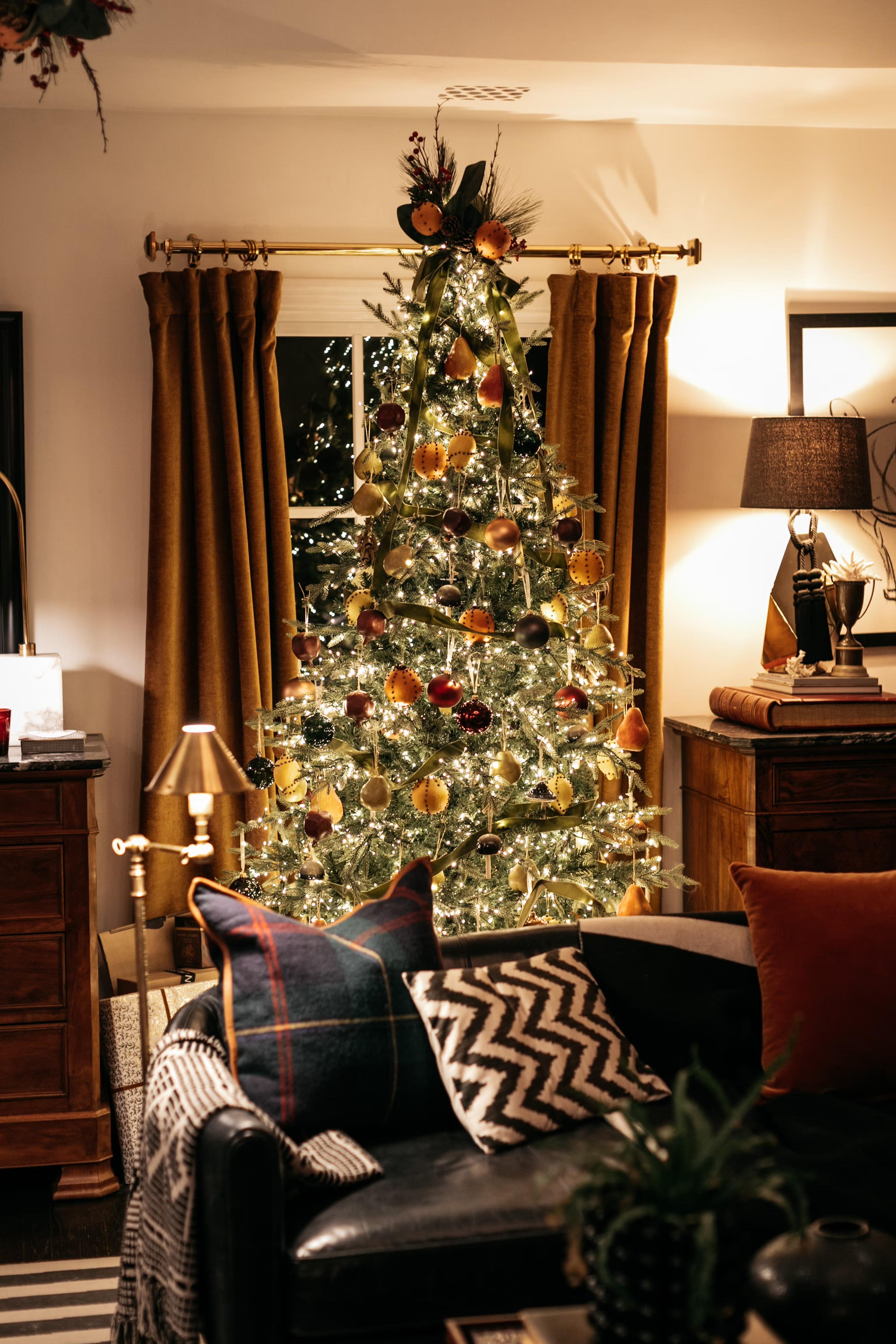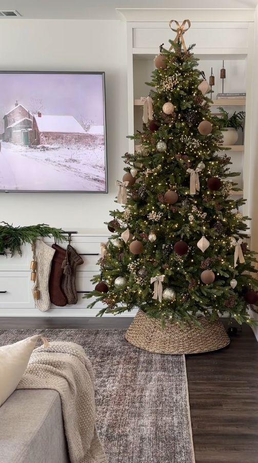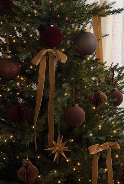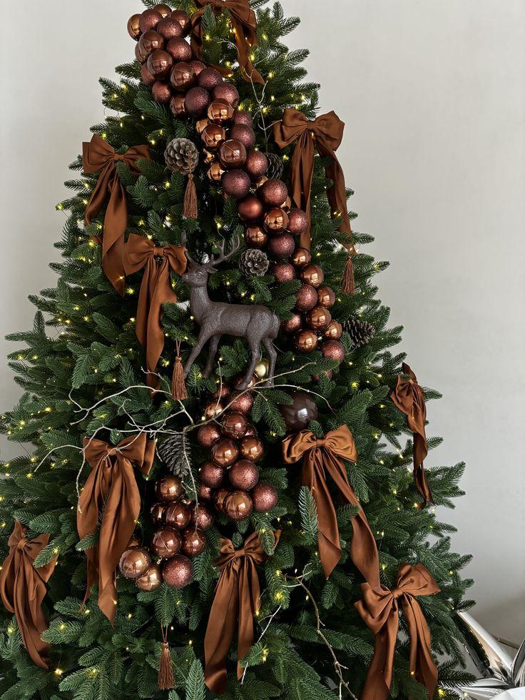 Этот цвет принято ассоциировать с осенью, но в последнее время он стал особенно востребован в новогоднем декоре (как и многие осенние украшения, кстати). Его мягкий оттенок согреет в холодную зиму и подчеркнет красоту зеленой ели.