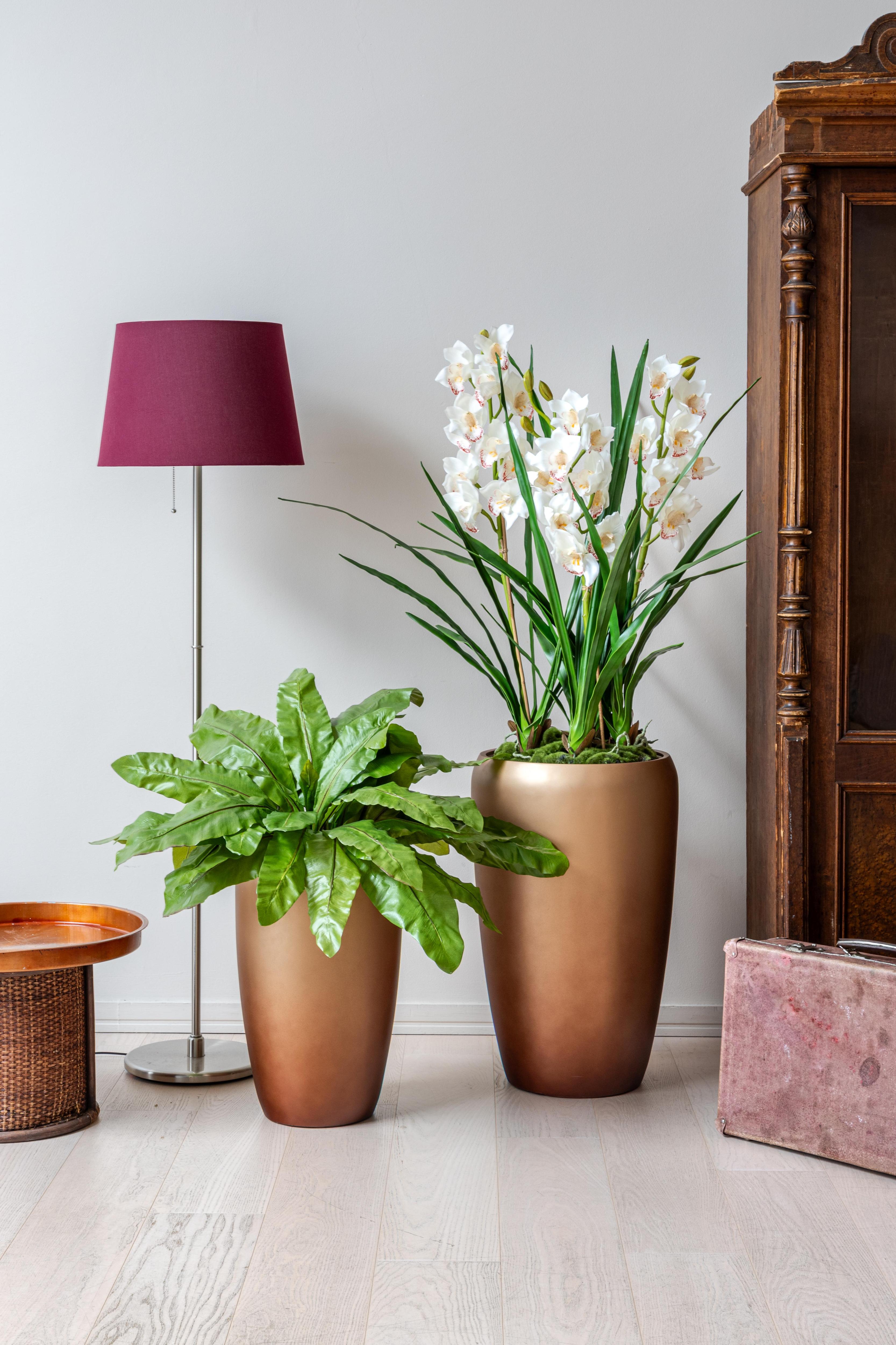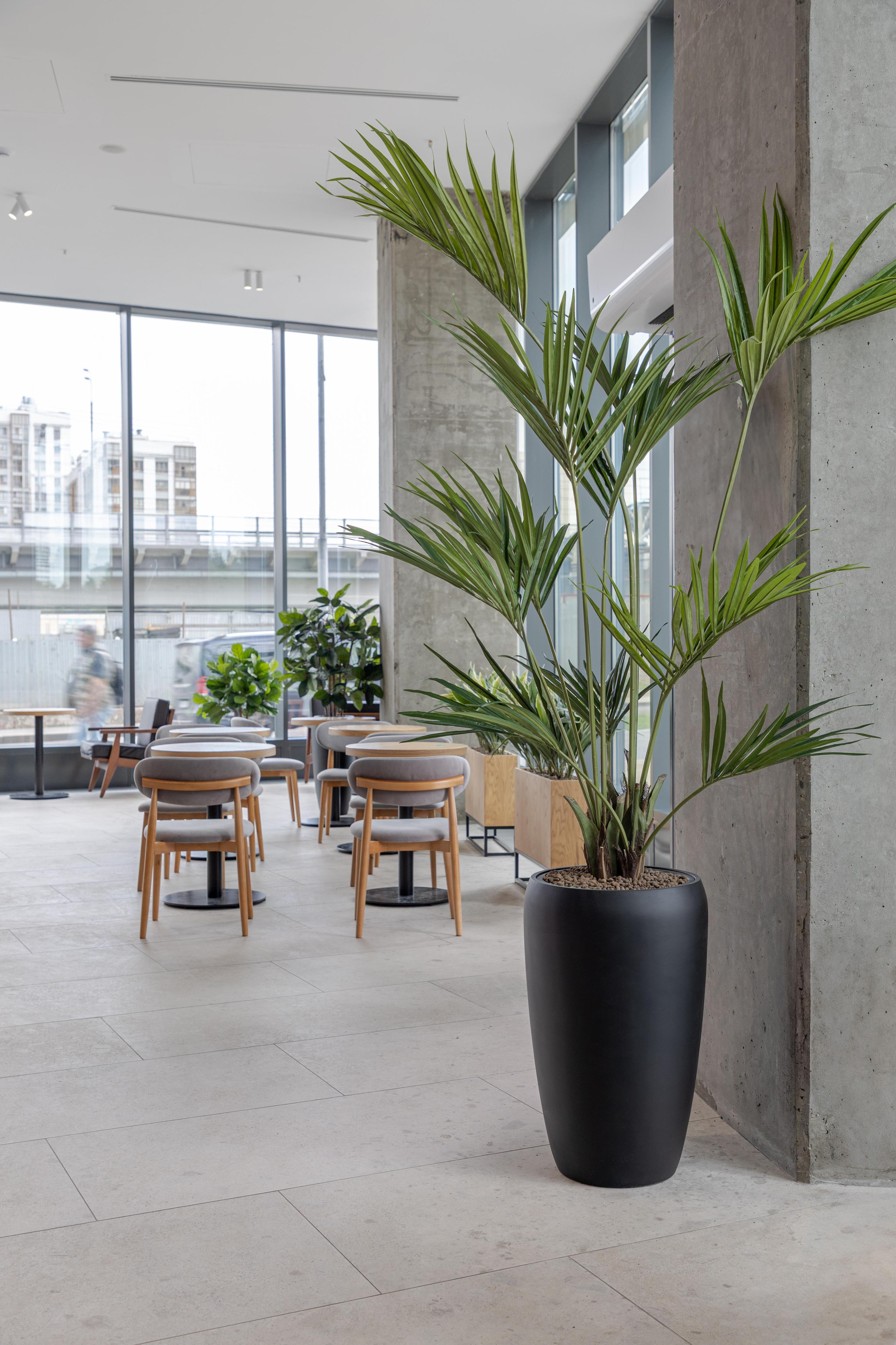 В современных проектах озеленения дизайнер может легко подобрать сочетание растения и кашпо: крупное растение чаще визуально превышает размер сосуда, но высокое эффектное кашпо может стать главным элементом, дополненное не слишком крупными растениями. Так создается гармония, соответствующая стилю интерьера, а каждая композиция становится полноценным декоративным объектом.