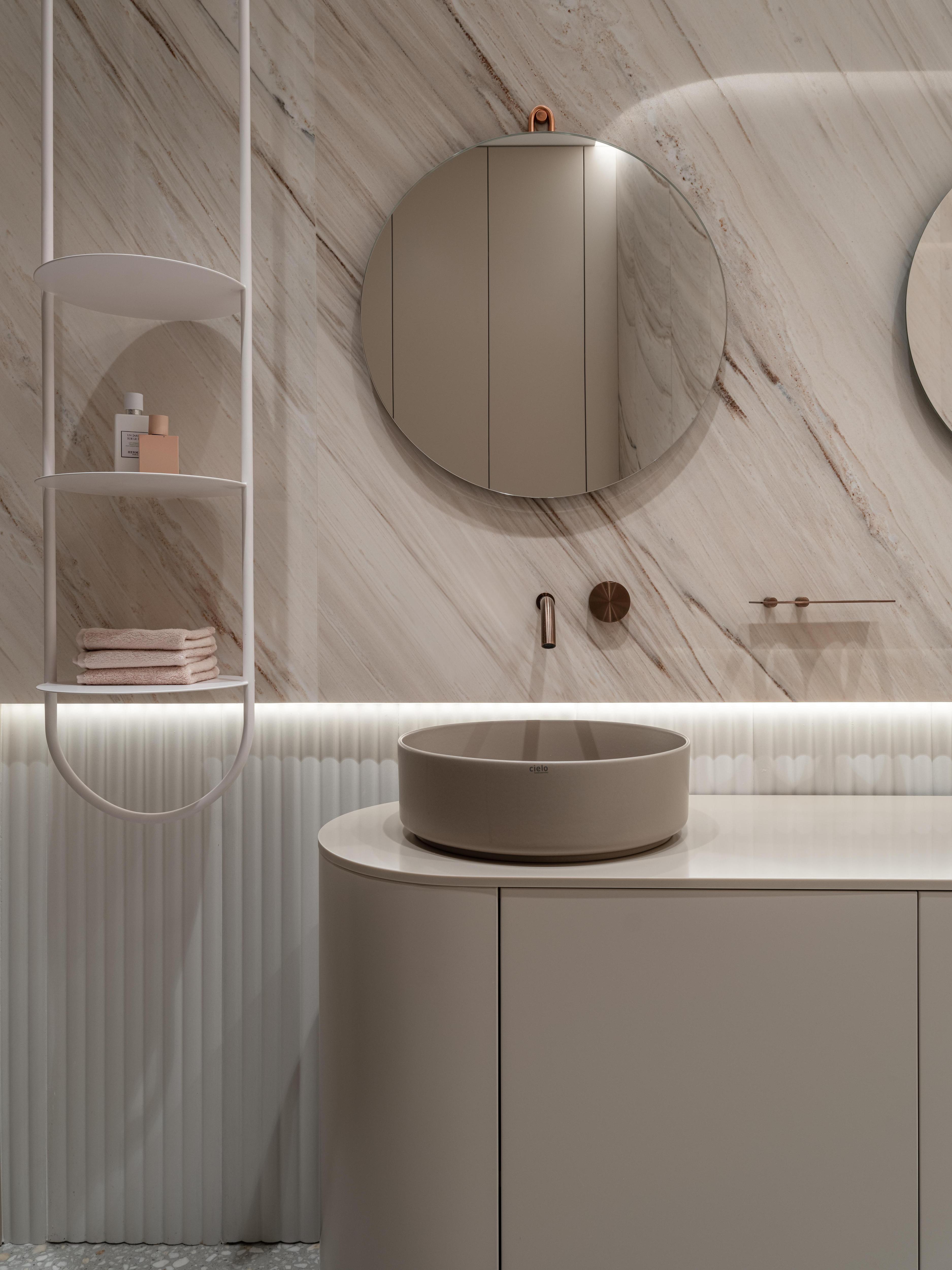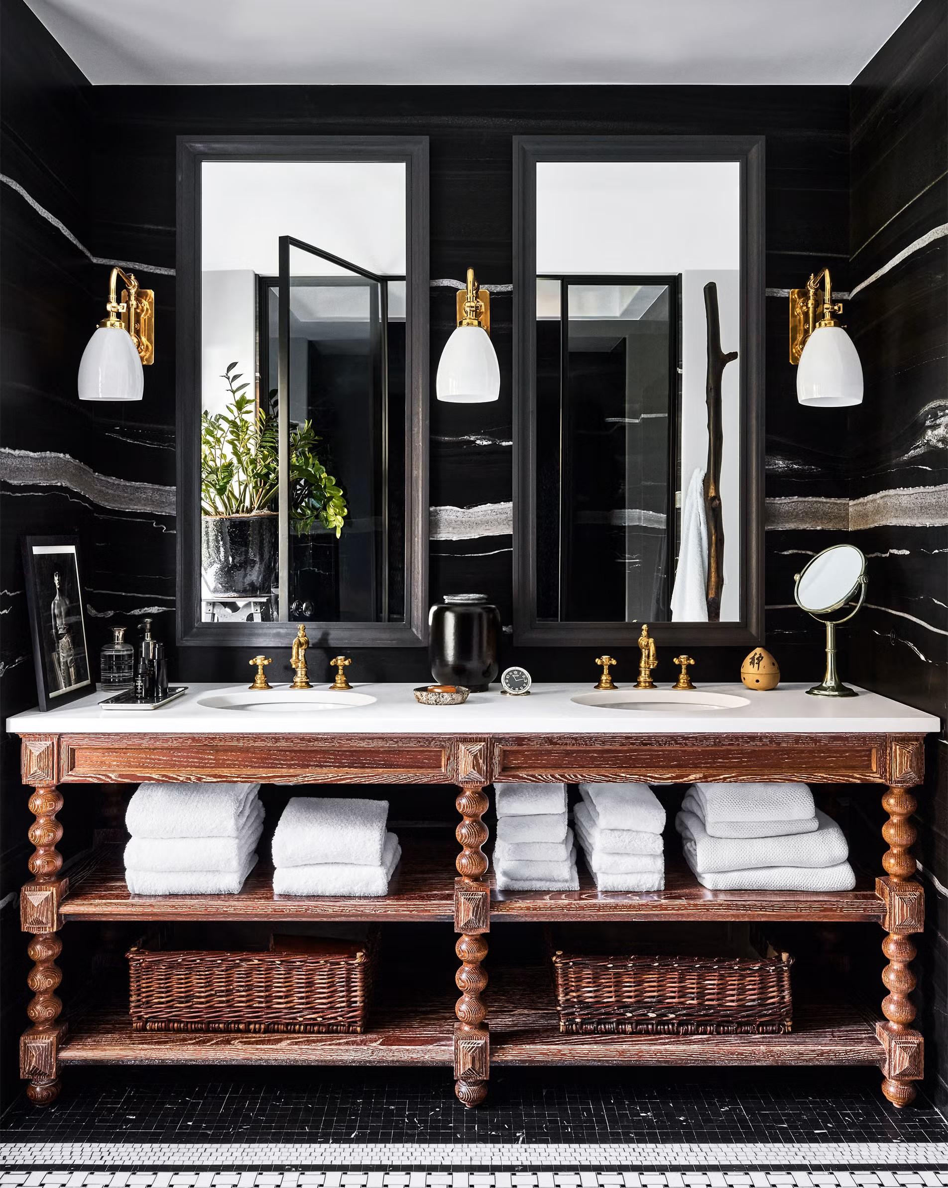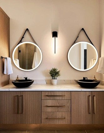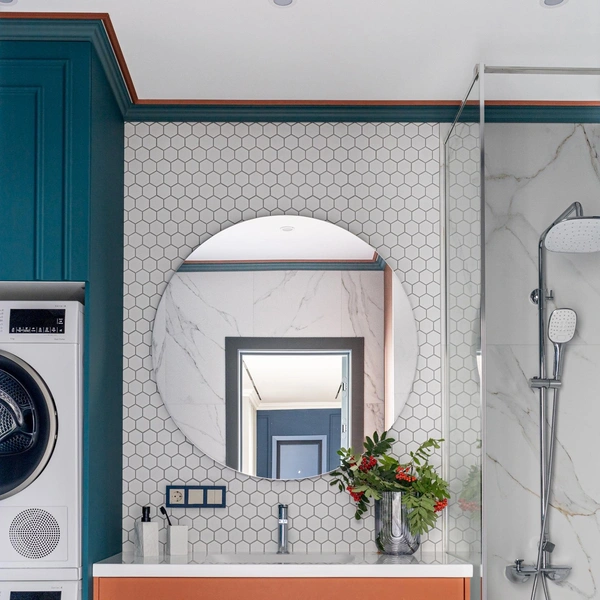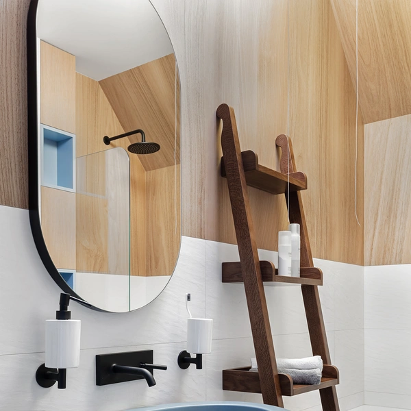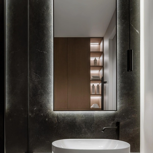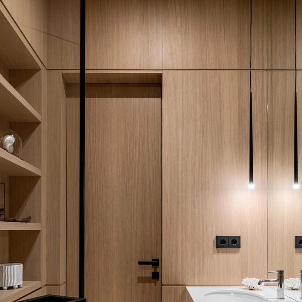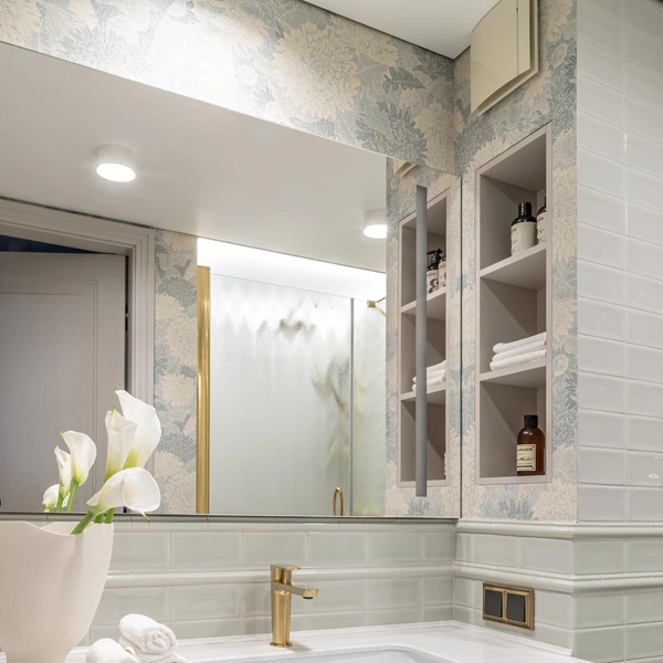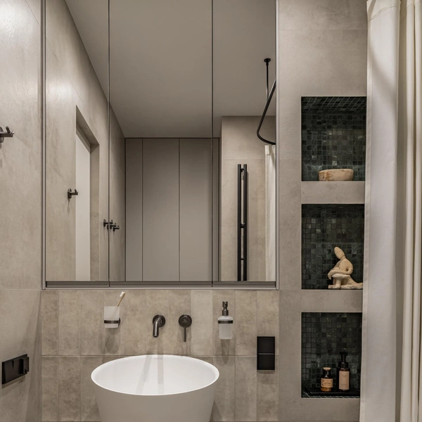 Там можно хранить индивидуальные наборы косметики, полотенца и аксессуары. Симметрия создает ощущение порядка, спокойствия и баланса, что особенно важно в помещении, предназначенном для расслабления.