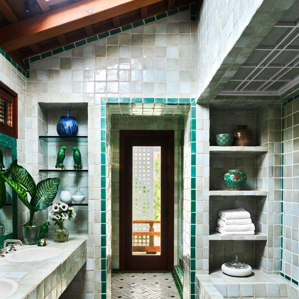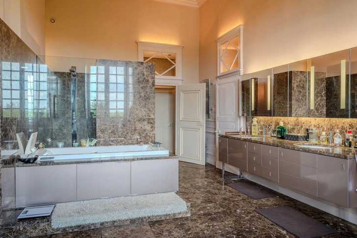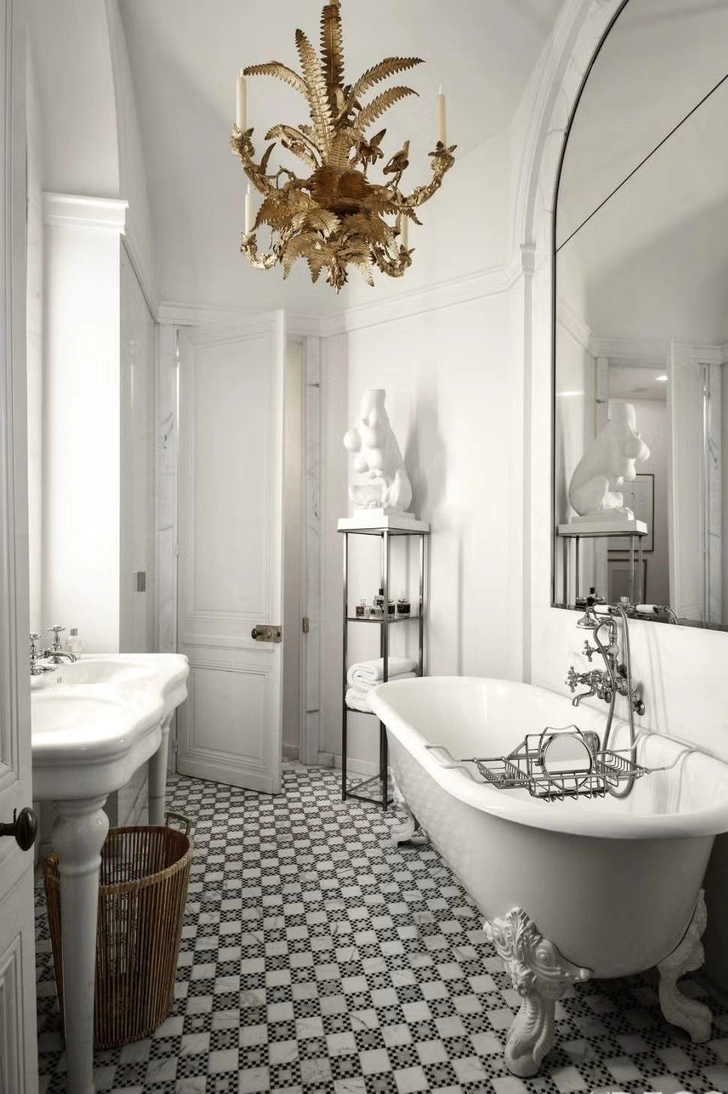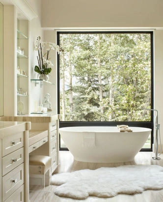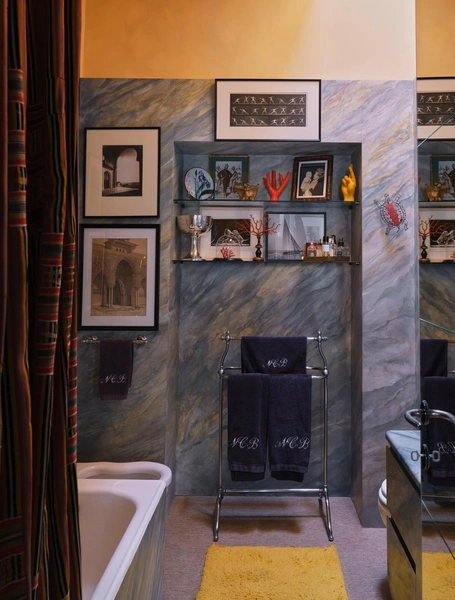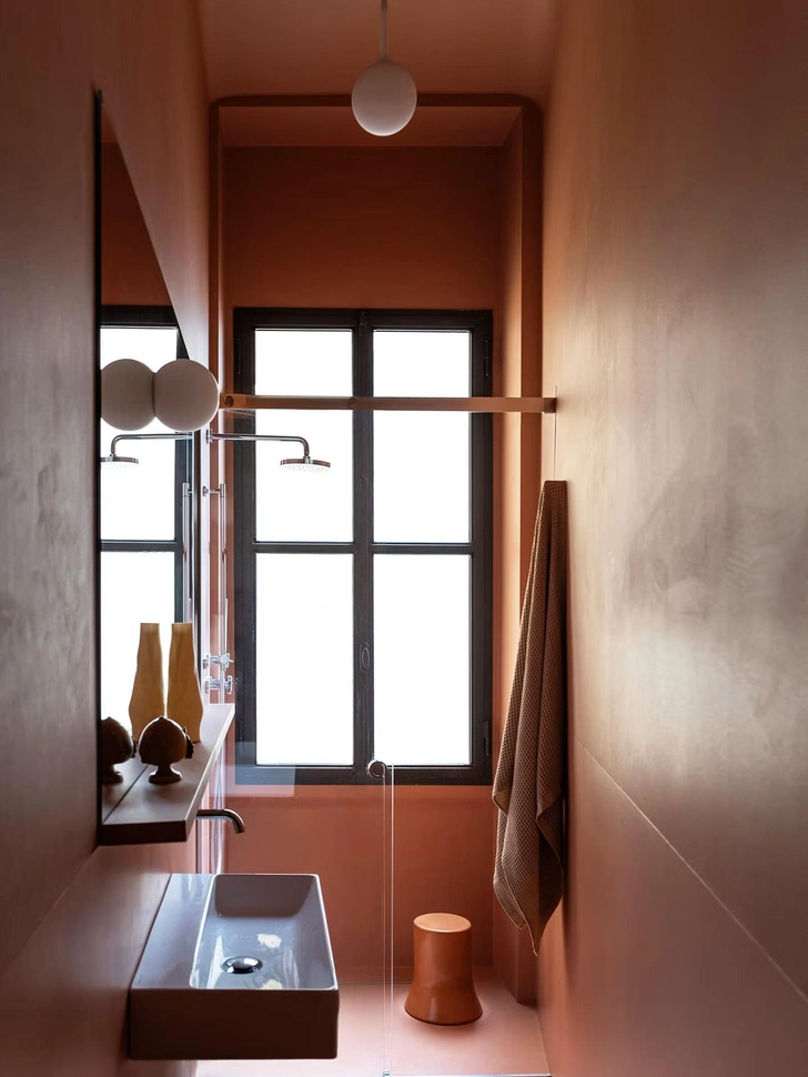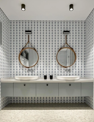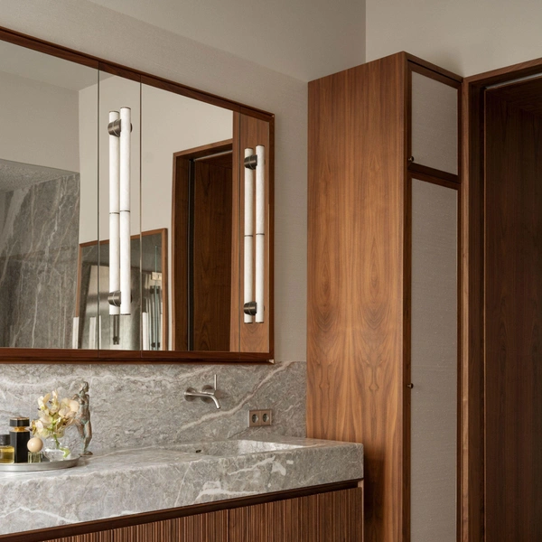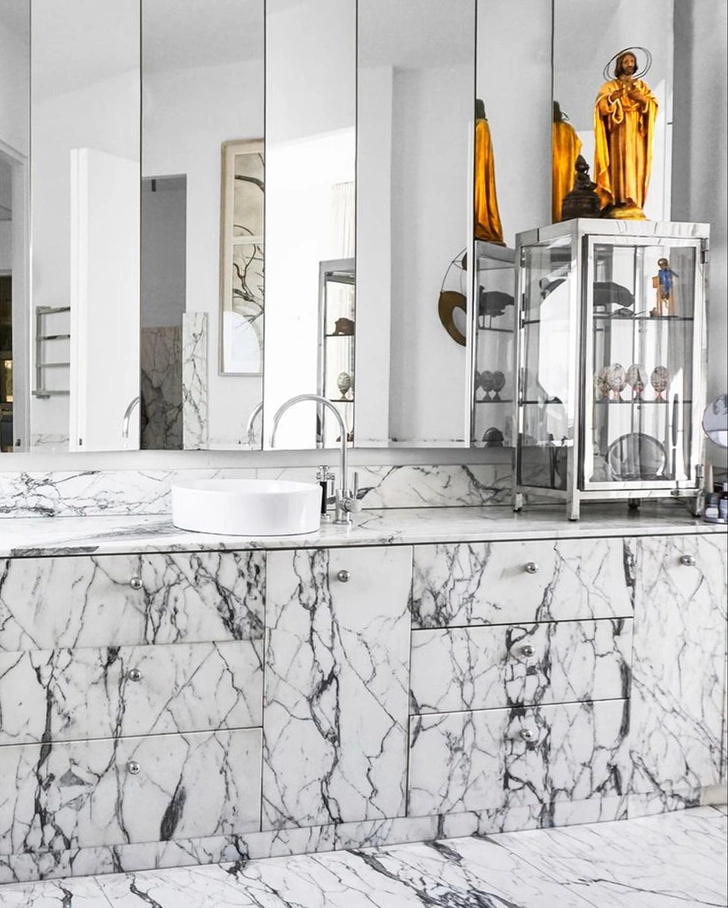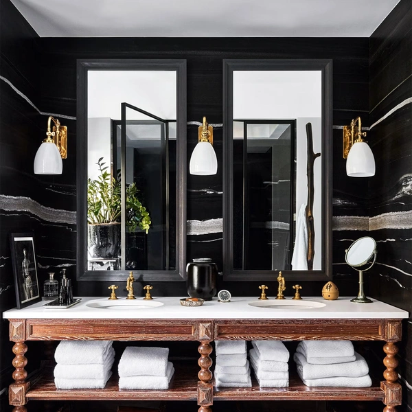 Там можно хранить индивидуальные наборы косметики, полотенца и аксессуары. Симметрия создает ощущение порядка, спокойствия и баланса, что особенно важно в помещении, предназначенном для расслабления.
