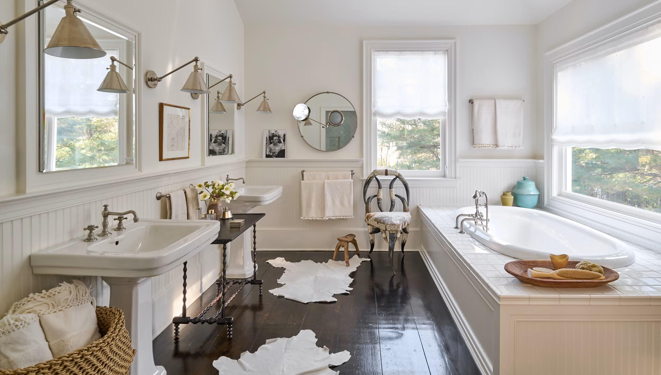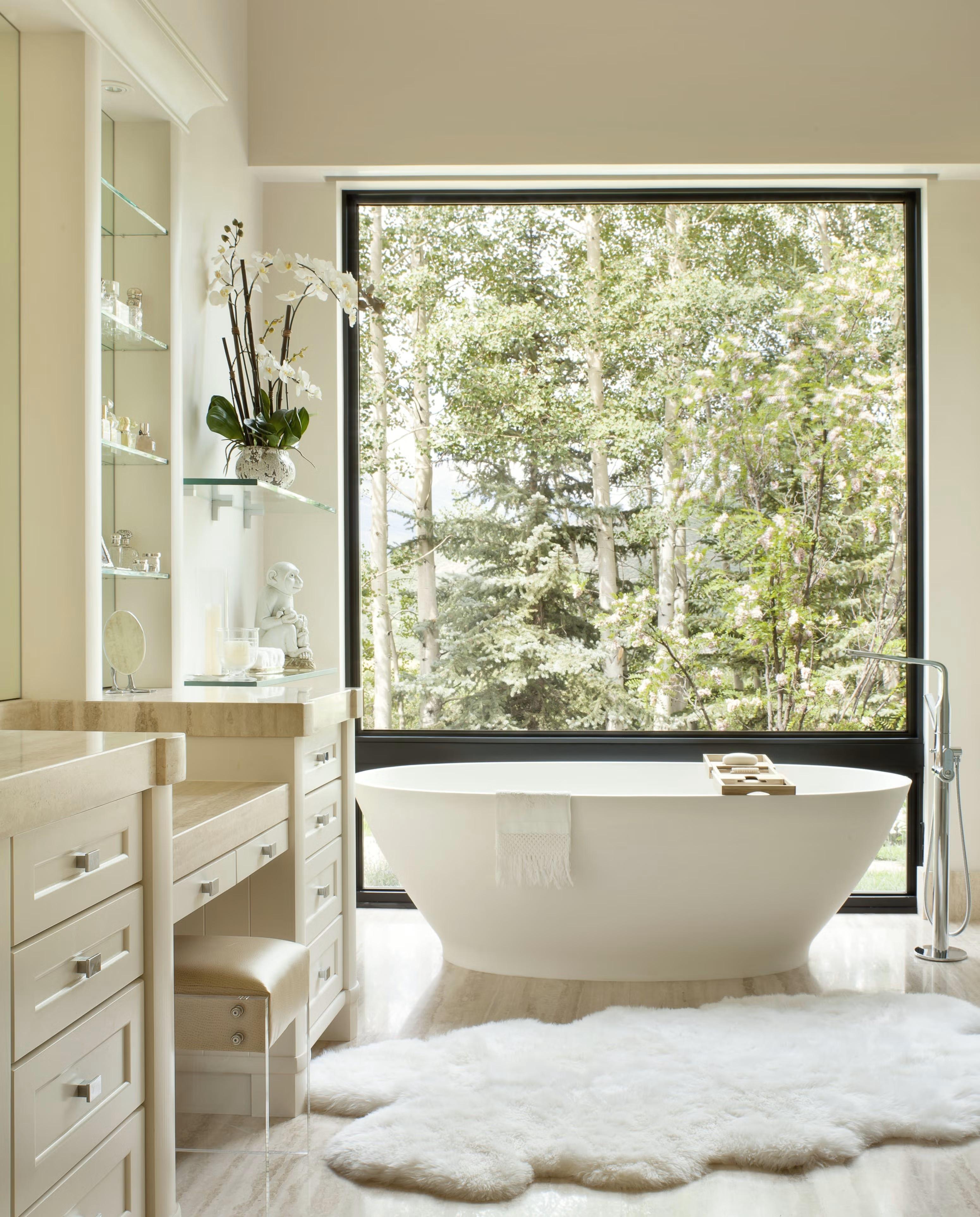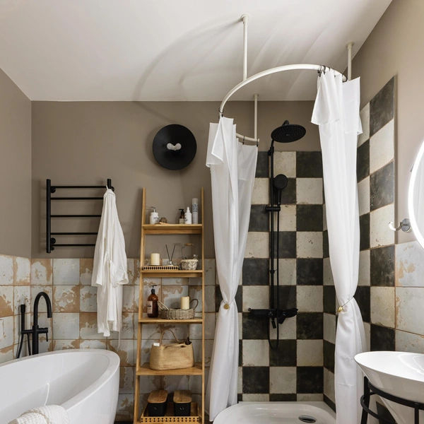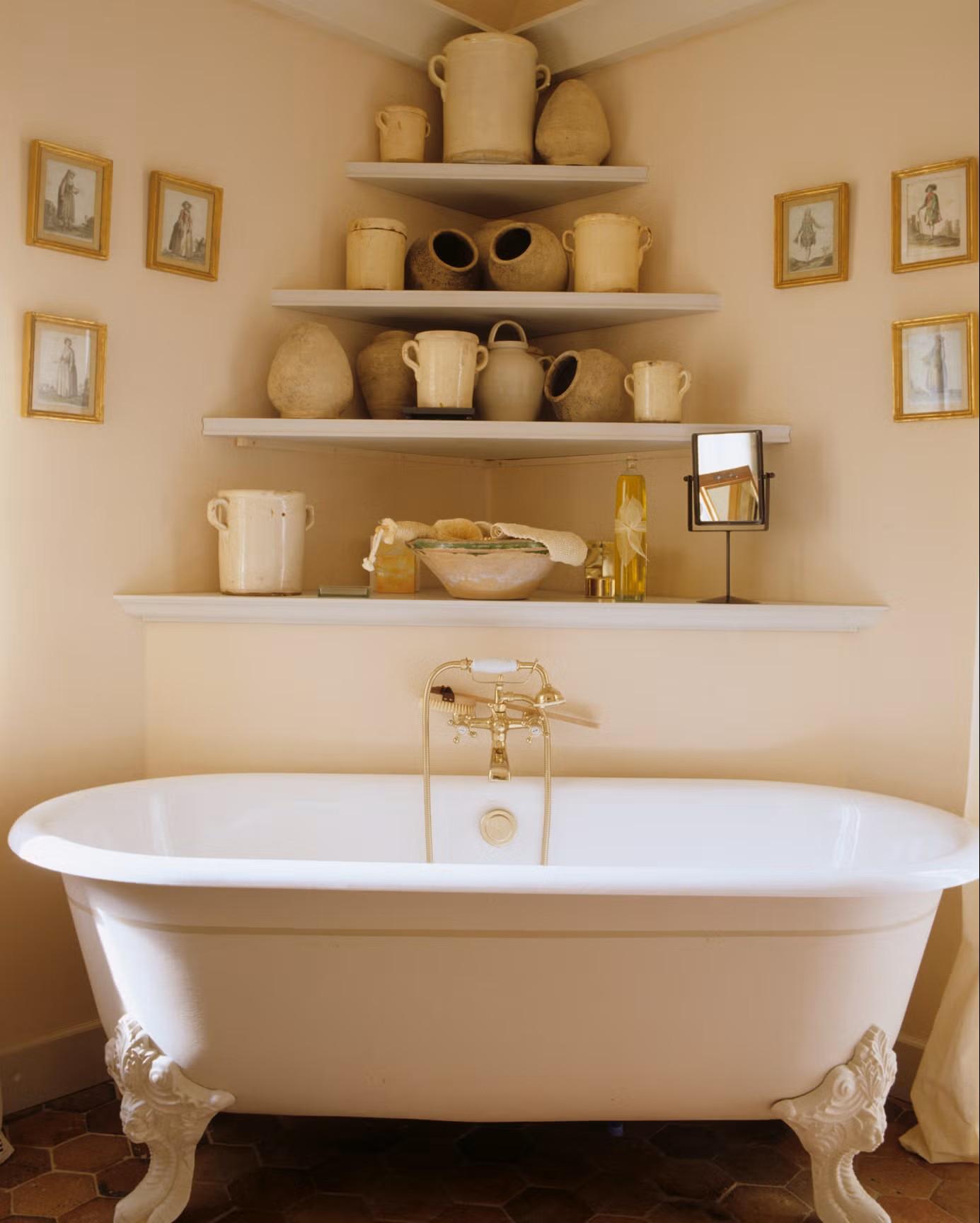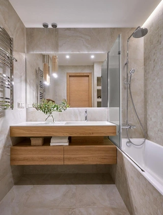 На такую поверхность ставят водонепроницаемый поднос или деревянную панель, куда складывают банные принадлежности. Это быстрое и бюджетное решение, не требующее монтажа и сверления стен, которое особенно актуально для съемного жилья.