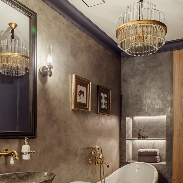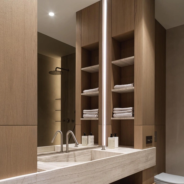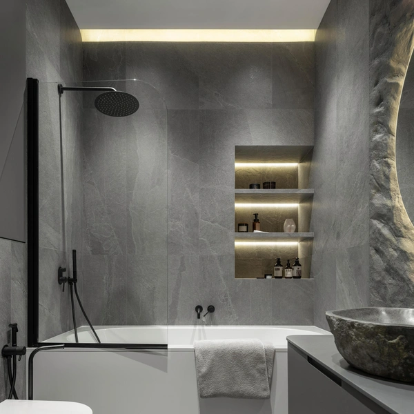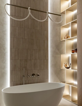 Светодиодная лента, встроенная под полкой или по контуру ниши, выполняет сразу две функции: практическое освещение и создание атмосферы. Мягкий рассеянный свет подчеркнет фактуру материалов и красиво выделит предметы на полках.