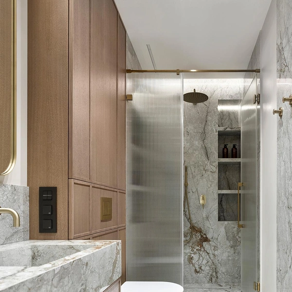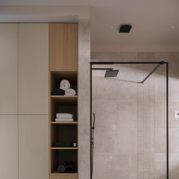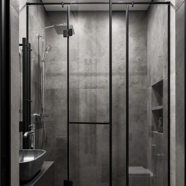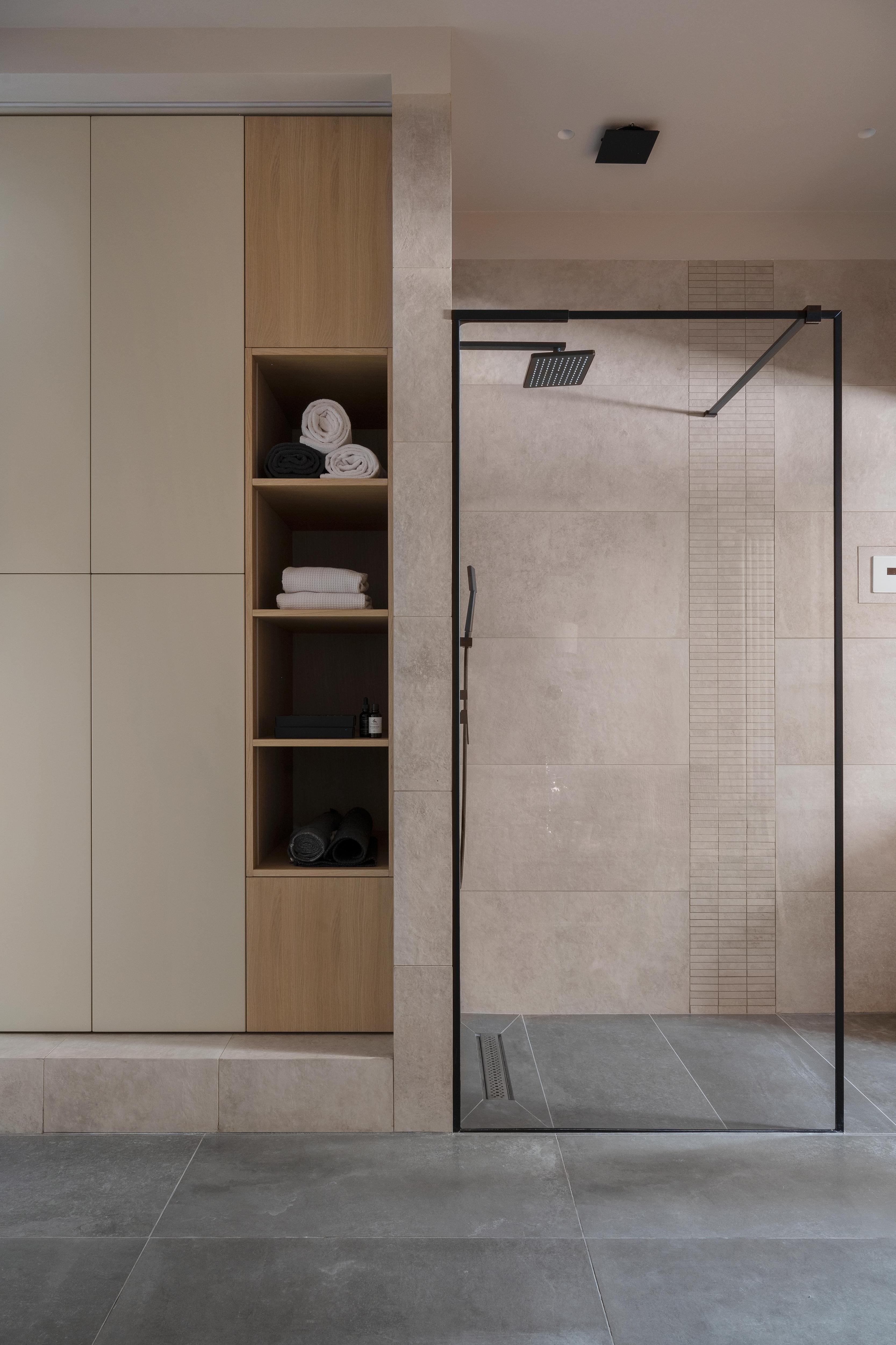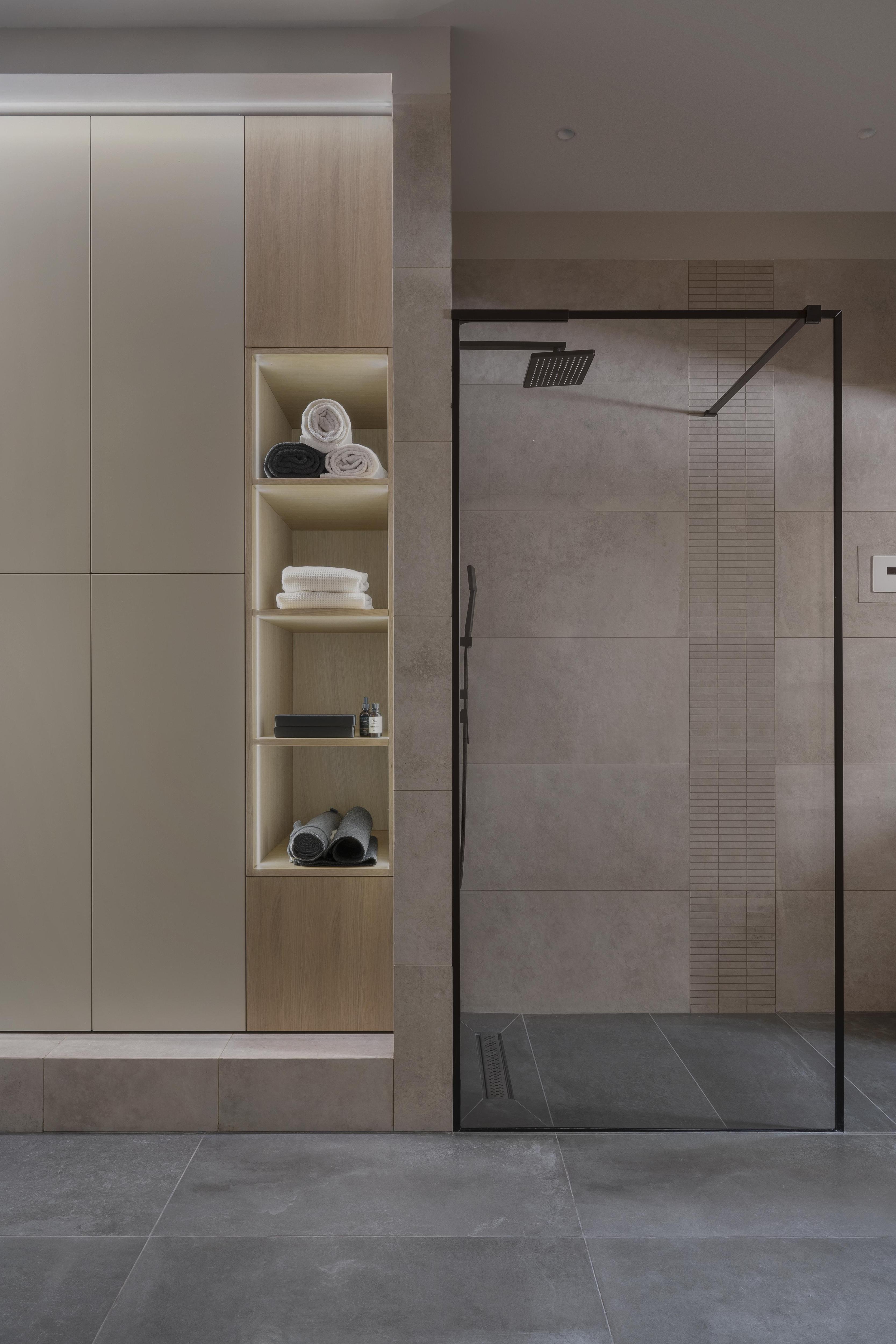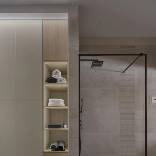 В душевой зоне со стеклянной перегородкой можно предусмотреть хранение, встроив полки прямо в торец стеклянного экрана или в примыкающую к нему стену. Для этого используют специальные профили, которые удерживают стеклянные полки и одновременно являются частью каркаса. Получается очень лаконичное и технологичное решение, где все банные принадлежности спрятаны, но находятся в шаговой доступности.