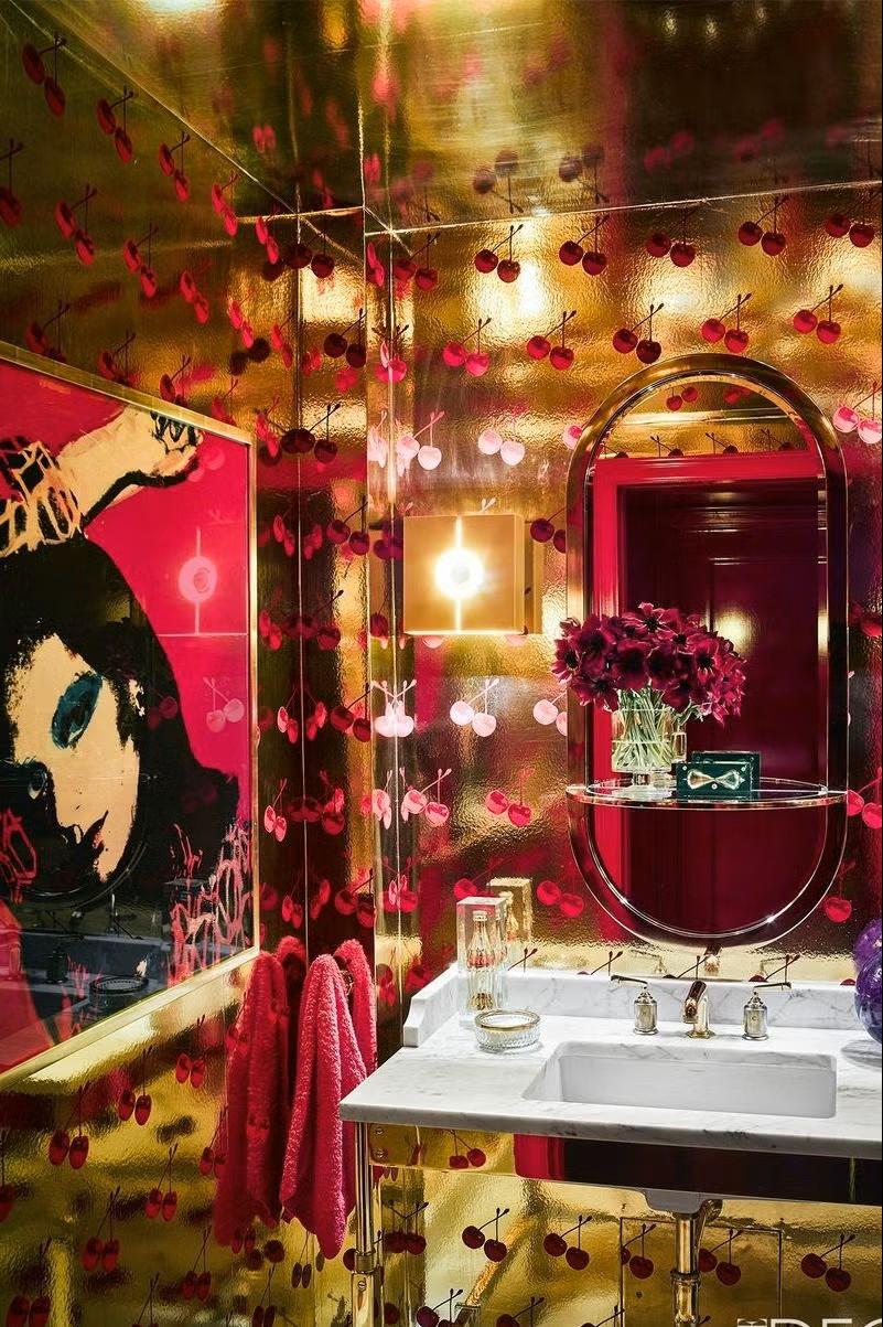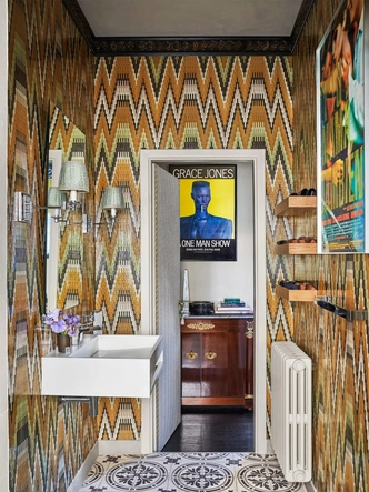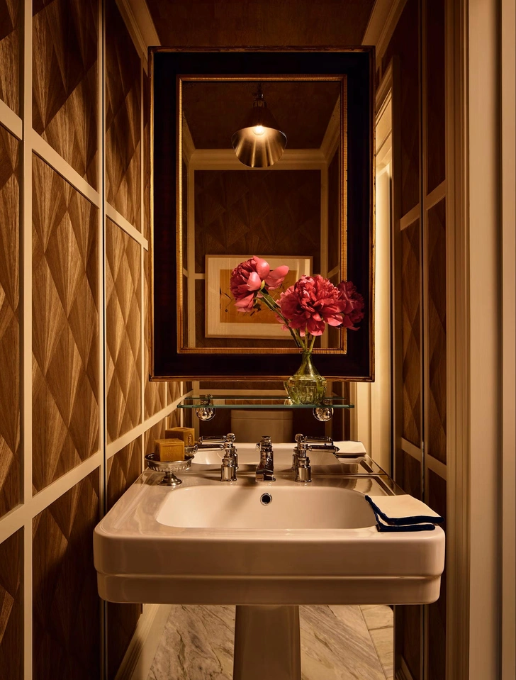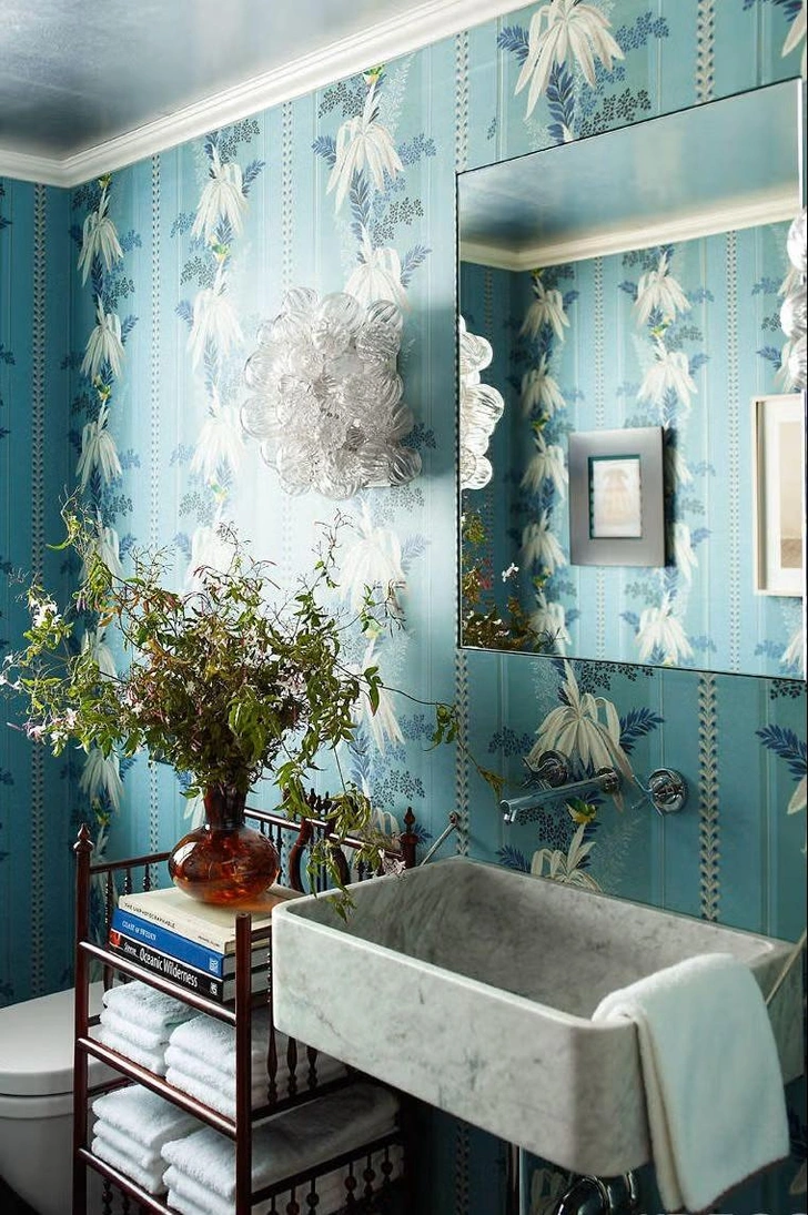 Дом в Подмосковье. Проект архитекторов Татьяны Григорьевой и Сандры Балоян. Гостевой санузел. Обои, Fornasetti. Подвесная люстра Arabesque, Lampadari.