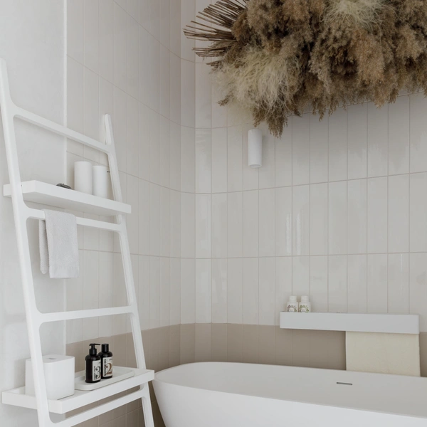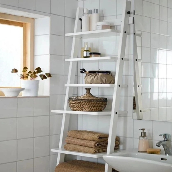 На перекладины вешают небольшие крючки для мочалок, резинок и халатов. Лестницу можно покрасить в яркий цвет, чтобы она стала цветовым акцентом в нейтральном интерьере. Это мобильное решение, которое в любой момент можно переставить или убрать.