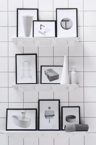 На эту полку ставят легкие, но эффектные предметы: аромадиффузоры, небольшие картины в рамах, сухоцветы в вазах. Важно надежно закрепить полку, так как падение предметов с высоты прямо на раковину может привести к травмам и порче сантехники.
