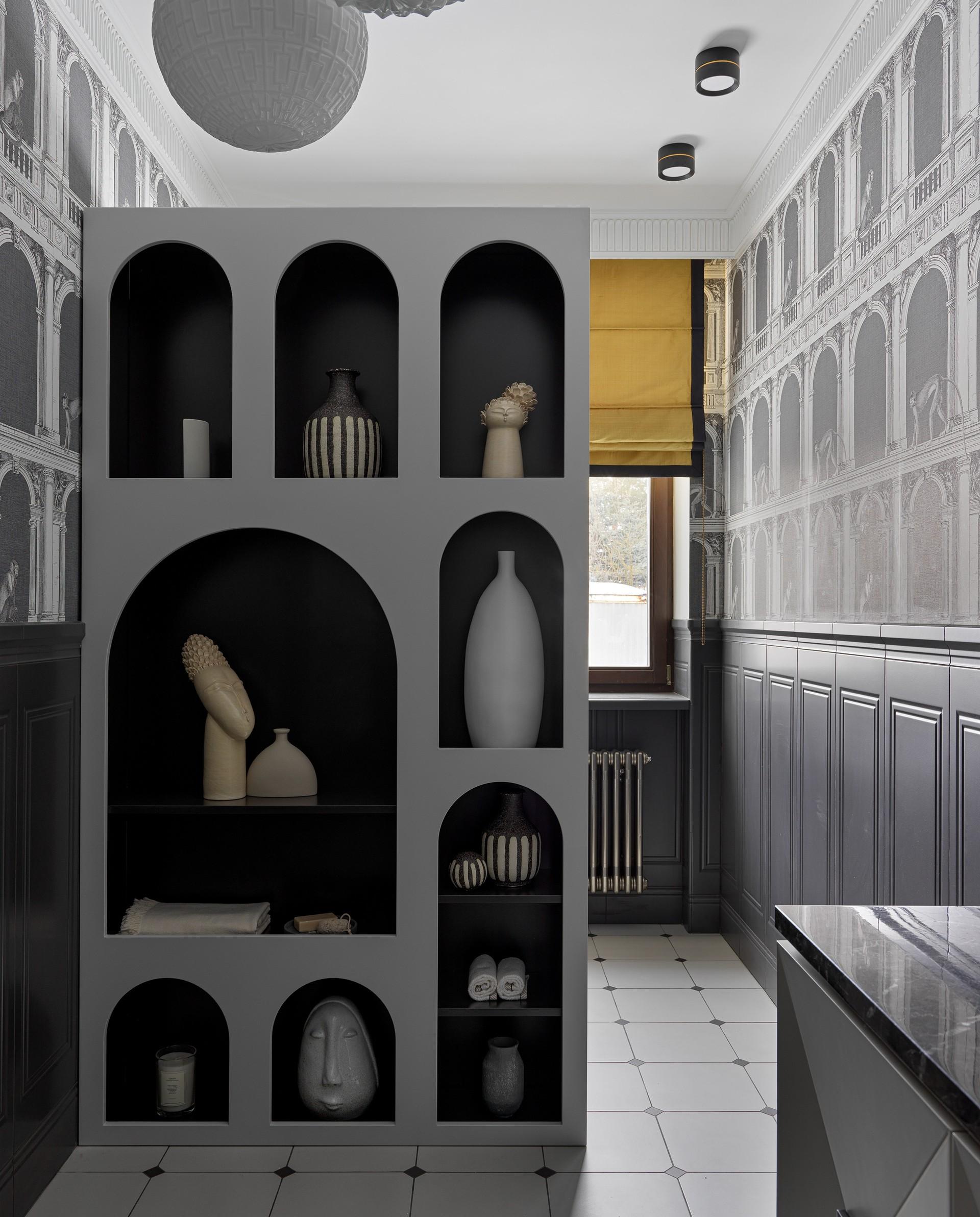 Полки делают разной глубины и высоты, чтобы можно было разместить предметы разного размера: от высоких ваз до плоских коробок. Такой стеллаж выполняет роль разделителя пространства, если его расположить между зоной умывания и зоной отдыха.