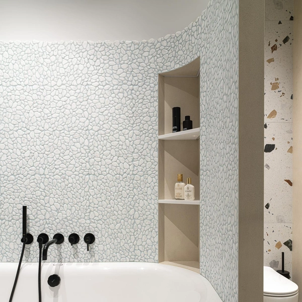 Для достижения эффекта монолитности полки изготавливают из того же материала, что и стены. Например, если стены облицованы крупноформатным керамогранитом, из его остатков вырезают полки, которые после монтажа и затирки швов выглядят как единая конструкция.