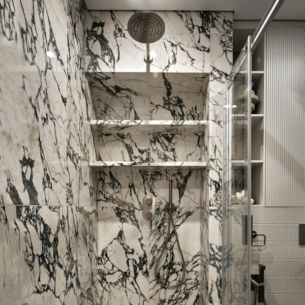 Ниши, специально созданные в капитальной стене во время ремонта, — это наиболее аккуратное и долговечное решение. Их можно расположить как в душевой зоне, так и рядом с ванной для хранения косметики и полотенец.