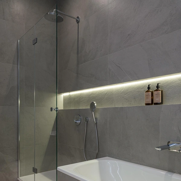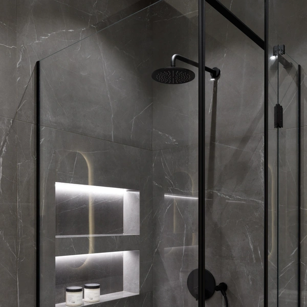 В небольших душевых кабинах нет места для громоздких полок, поэтому идеальным решением становится компактная встроенная ниша. Ее размещают на удобной высоте, обычно на уровне груди, чтобы не нагибаться за средствами для мытья.