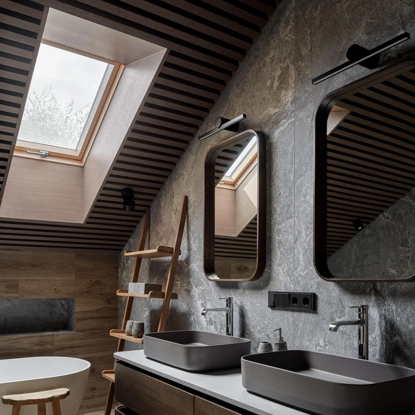 Если ванная комната оборудована сдвоенной раковиной, логичным решением будет симметричное хранение. Два одинаковых стеллажа, установленных по бокам от зеркал или внизу, обеспечивают личное пространство для каждого пользователя.