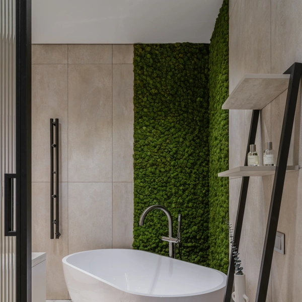 В просторной ванной стеллаж во всю высоту стены может стать ключевым элементом дизайна. Его изготавливают из контрастного материала, например, черного металла и темного дуба, чтобы создать выразительный вертикальный акцент.
