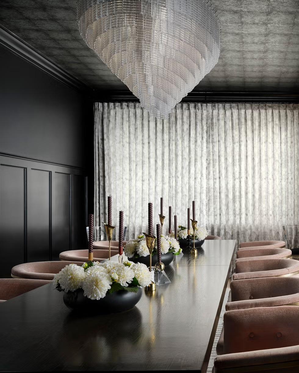 А как насчет металлического потолка? Co-Direction Design, например, сделали потолок из латуни. Это не самое популярное решение, так что выглядит необычно, а главное — отражает свет и делает пространство объемнее и ярче.