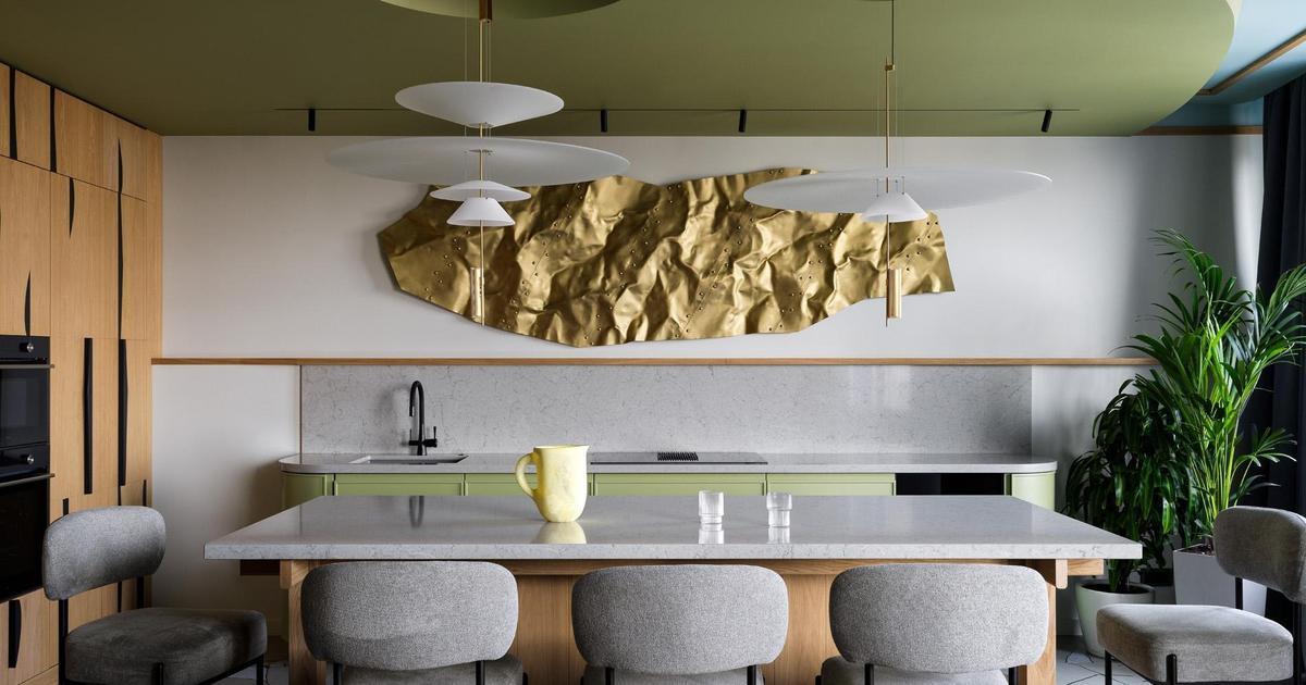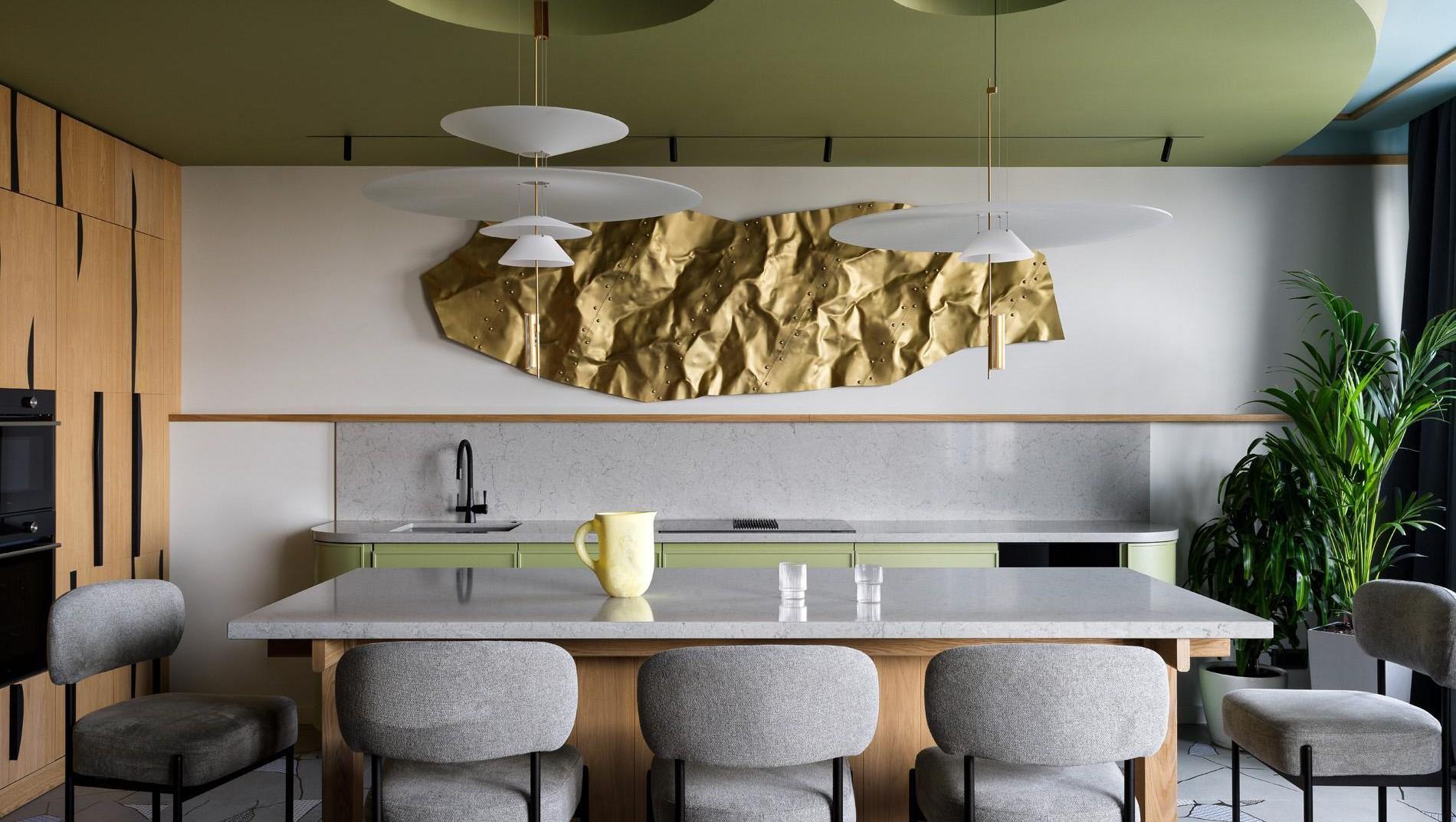 Комбинации могут быть разные: кому-то нравится оставлять стены в нейтральных тонах и выделять потолок, а кому-то нравятся более сложные колористические решения из нескольких активных оттенков, дополняющих друг друга. Не забываем про колорблокинг — не только эффектный прием, но и хороший способ зонировать пространство, выделив каждую его часть своим цветом. В проекте Михаила Курносова часть стены и потолка разделяет кухню и гостиную в открытом пространстве — к тому же, дизайнер обрамил границу пепельно-розовым цветом.