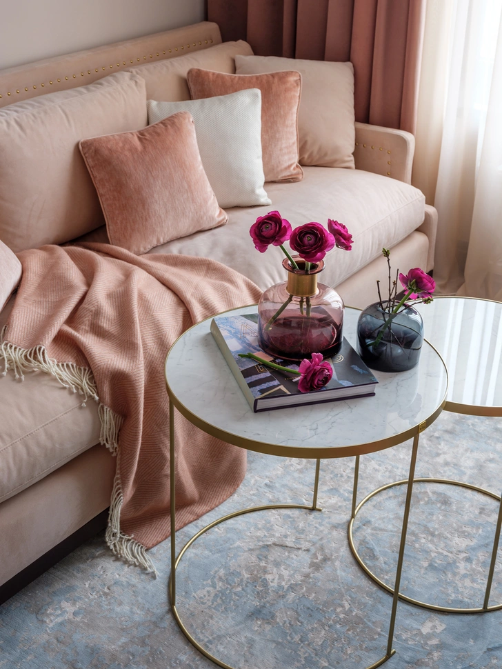 Такие оттенки помогают бороться с мрачностью осенних дней, напоминая о цветении и обновлении. Особенно органично эти тона вписываются в спальню, зону отдыха или творческий уголок. В сочетании с мягким теплым освещением они способствуют расслаблению и мечтательности.