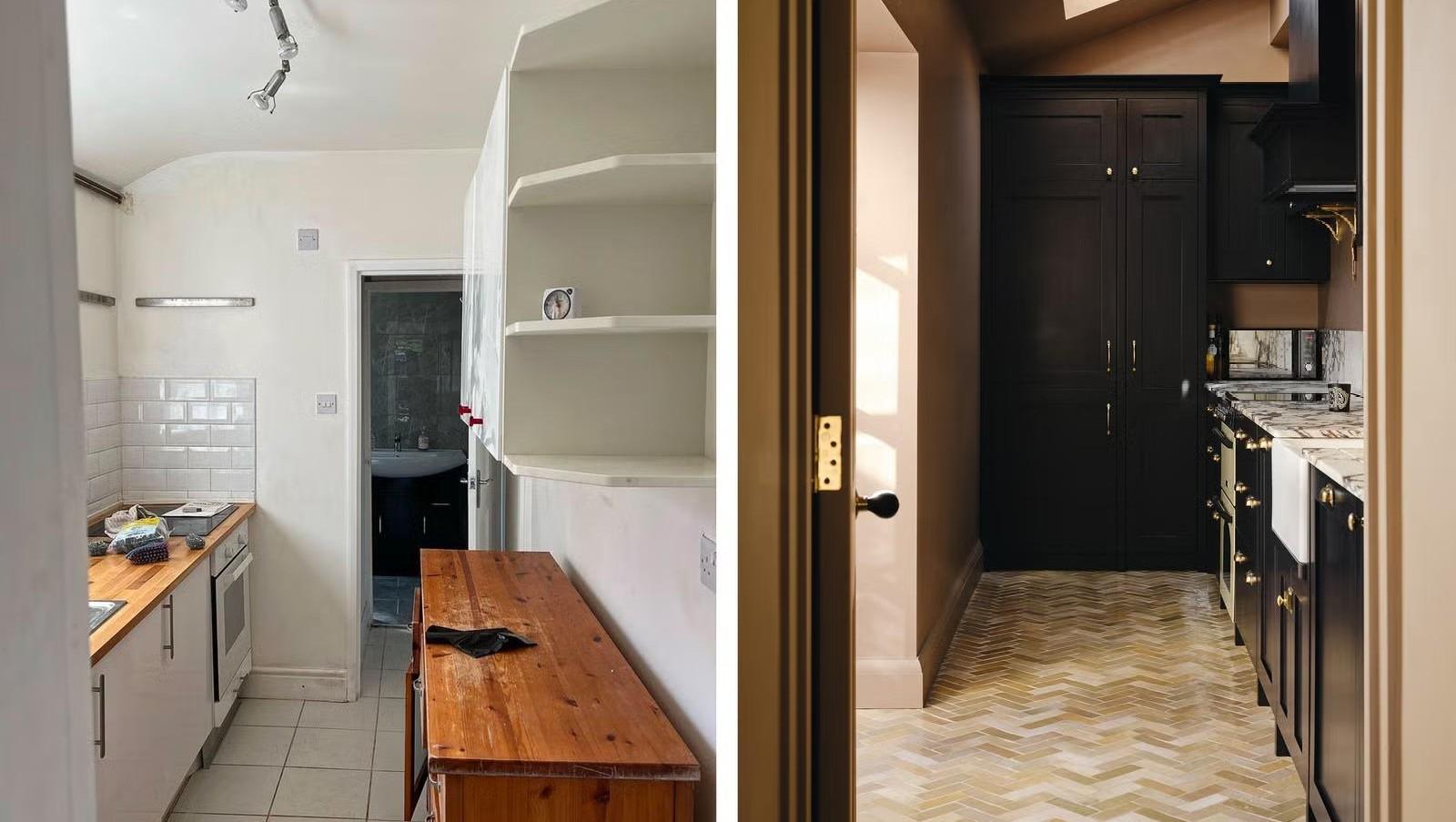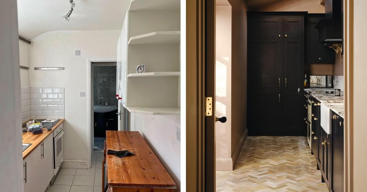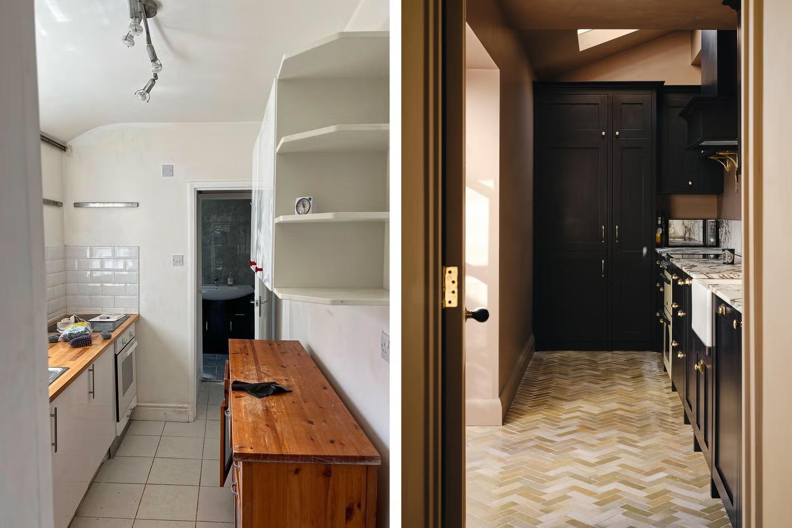 Для шкафов Чарли выбрала черную краску Paean Black от Farrow & Ball с легким фиолетовым подтоном, а латунные ручки купили на Etsy. Стены и потолок покрасили мягким оттенком розового Sulking Room Pink, тоже от Farrow & Ball. Благодаря покраске потолка кухня стала выглядеть уютнее.